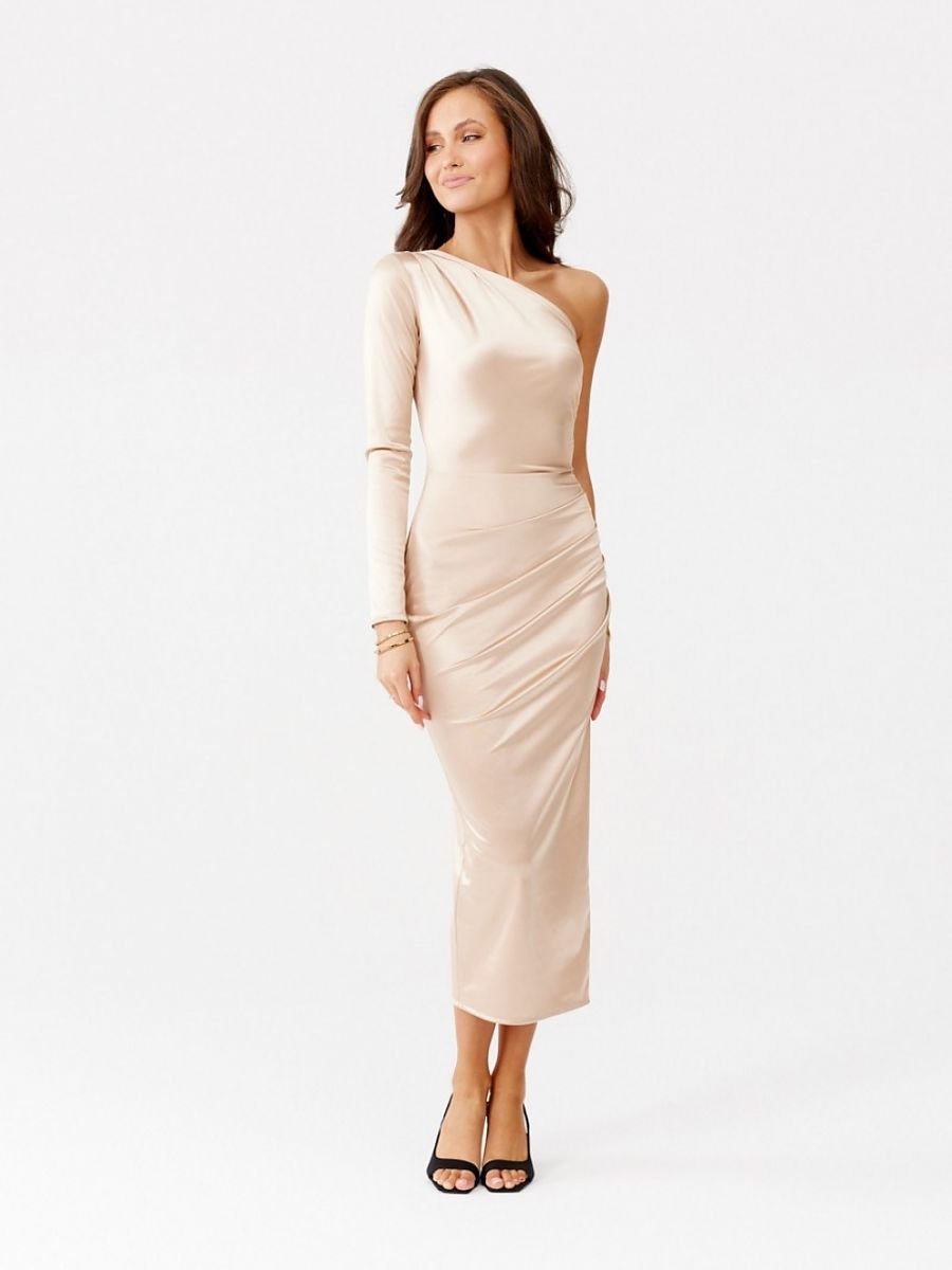 Sukienka midi z jednym długim rękawem z subtelnym rozcięciem przy nodze wykonana jest z delikatnej satynowej tkaniny, która ładnie dopasowuje się do sylwetki. Po boku marszczenie, które idealnie tuszuje ewentualne niedoskonałości. Oryginalny krój z jednym rękawem nadaje jej wyjątkowy charakter. Zapinana na kryty zamek błyskawiczny z boku sukienki. Ta midi sukienka jest nie tylko elegancka, ale także funkcjonalna. Długość midi nadaje sukience wytwornego, kobiecego stylu. Ten krój sukienki pozwoli Ci czuć się oryginalnie podkreślając Twój indywidualny styl i z pewnością przyciągnie uwagę wyróżniając Cię z tłumu niezależnie od okazji. Produkt jest wyprodukowany i uszyty w Polsce.