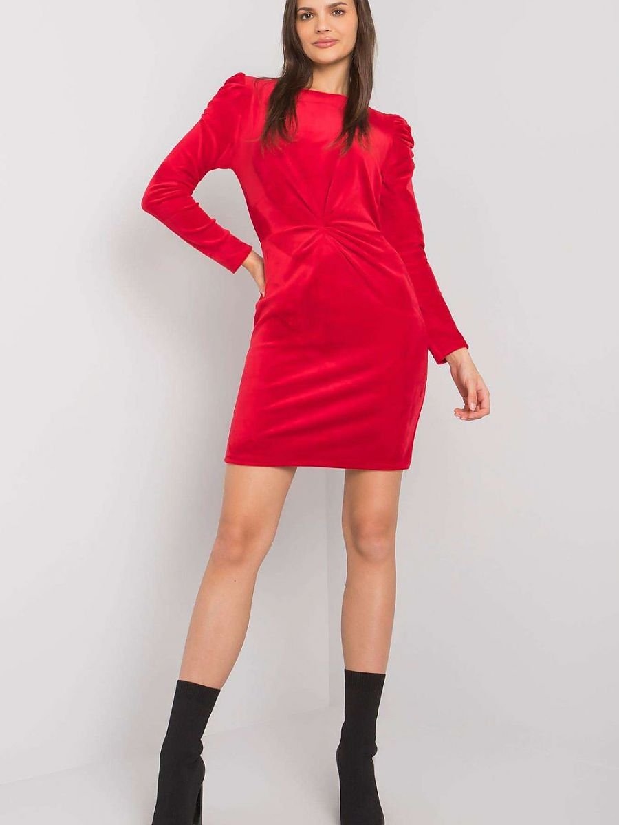 Czerwona dopasowana sukienka welurowa z długim rękawem. Na ramionach marszczenia. Idealna na wiele okazji.