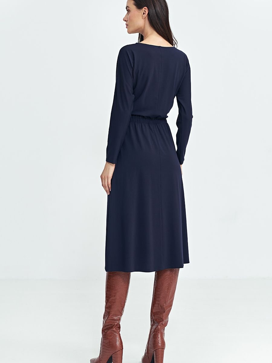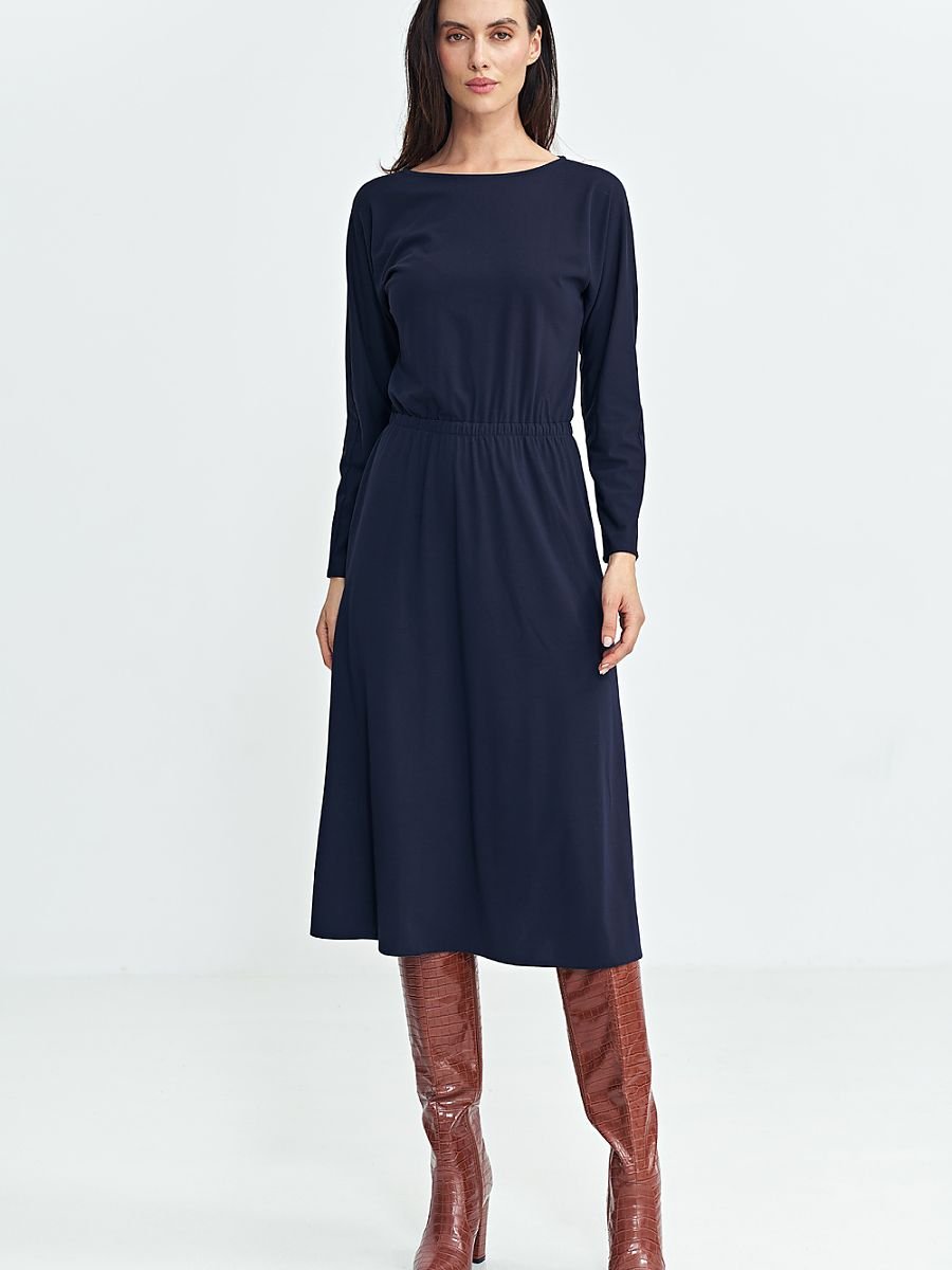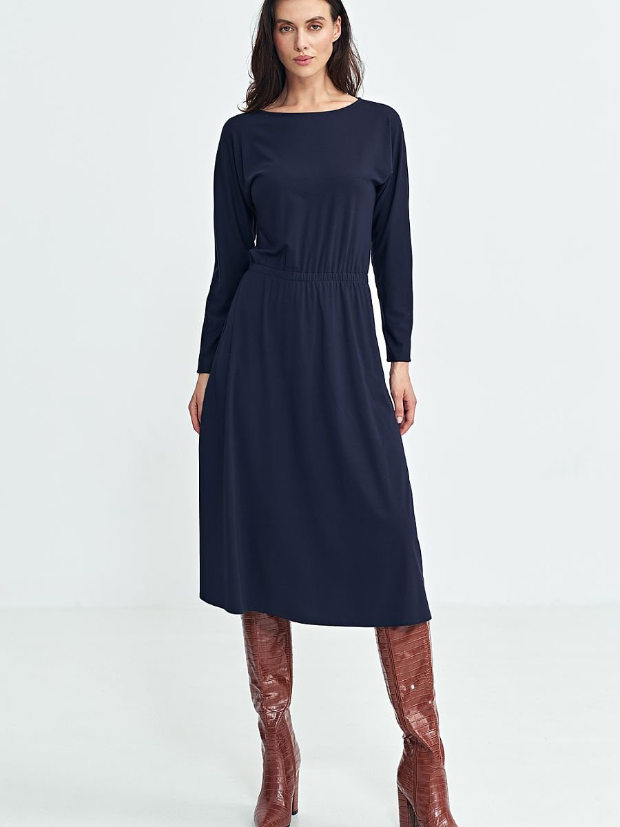 Ta uniwersalna sukienka to must-have w każdej garderobie. Wykonana z przyjemnego w dotyku modalu, zapewnia komfort noszenia przez cały dzień. Dekolt typu łódka subtelnie podkreśla szyję i ramiona, a długi, lekko nietoperzowy rękaw dodaje lekkości. Gumka w talii podkreśla sylwetkę i nadaje sukience kobiecego kształtu. Długość midi sprawia, że sukienka jest zarówno elegancka, jak i wygodna. Wkładana przez głowę, nie posiada zapięć, co dodatkowo zwiększa komfort użytkowania.