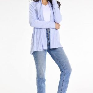 Stylowa narzutka bez zapięcia. Wykończony kontrastową lamówką. Kardigan o luźnym kroju.