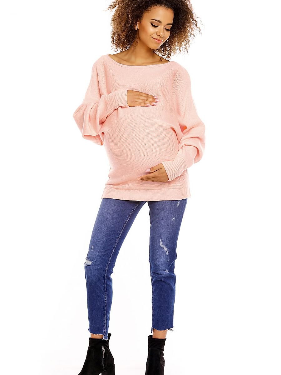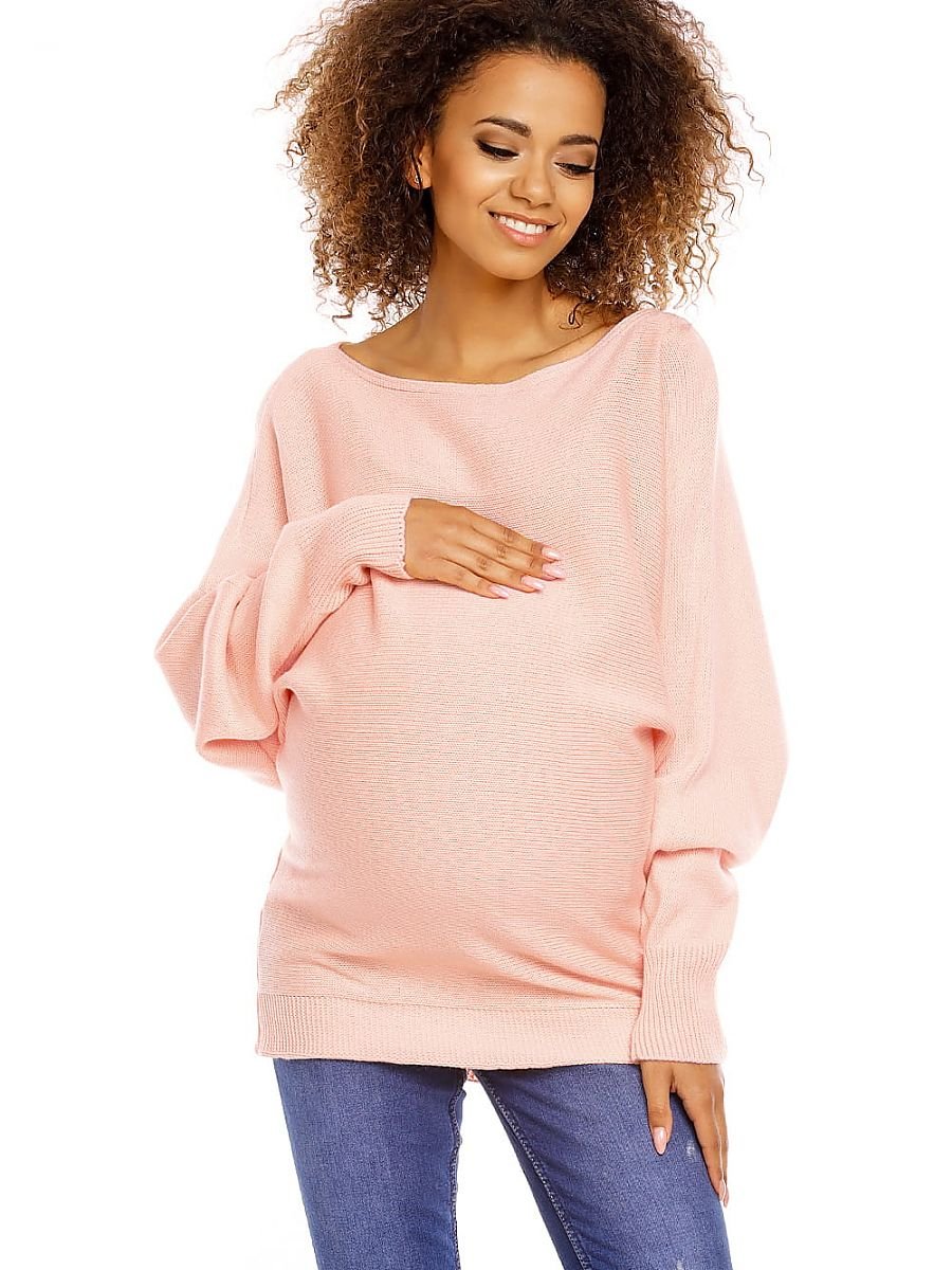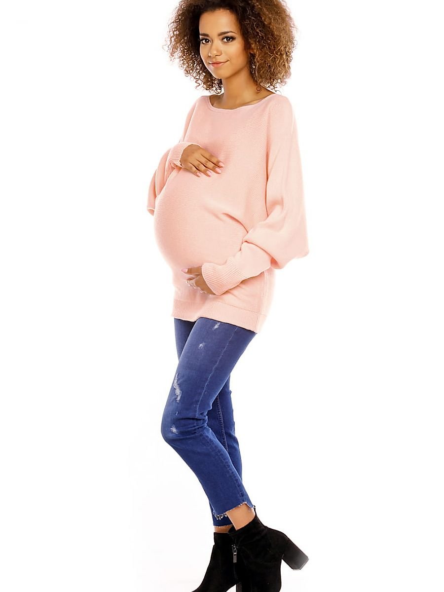 Krótki sweter ciążowy typu oversize. Dół i rękawy wykończone ściągaczem. Dekolt łódka, rękawy długie. Kimonowy fason maskuje rosnący brzuszek. Szeroki dekolt pozwala zalotnie odkryć ramię. Sweter wykonany z miękkiej i przyjemnej w noszeniu przędzy o delikatnym splocie.