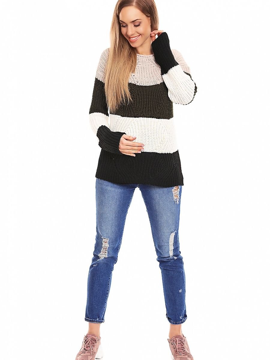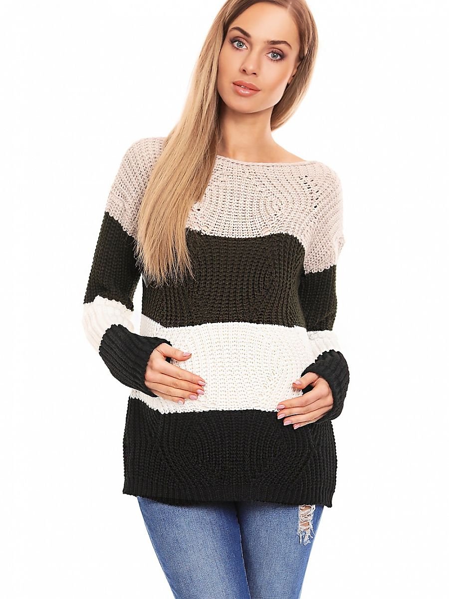 Sweter o grubym splocie w ciekawy wzór kolorowych pasów. Sweter z długim rękawem. Na przodzie ażurowy splot.