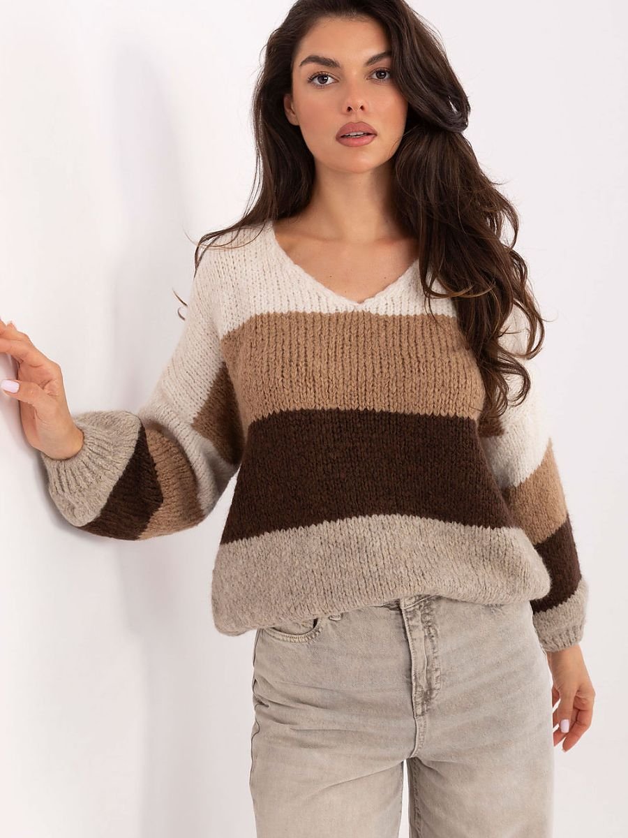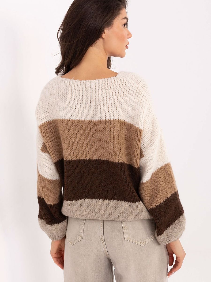 Sweter damski oversize w paski to modna propozycja w stylu casual, idealna zarówno na co dzień, jak i do pracy. Wykonany z mieszanki akrylu, wełny, wiskozy i poliamidu, jest miękki, przyjemny w dotyku i komfortowy w noszeniu. Luźny, oversizeowy fason zapewnia swobodę ruchów i nowoczesny wygląd. Wzór w paski nadaje mu energii i świeżości, doskonale wpisując się w codzienne stylizacje. Standardowa długość i długi rękaw sprawiają, że sweter jest praktyczny i wygodny. Dekolt w serek wysmukla szyję i podkreśla kobiecą sylwetkę. To uniwersalny model, który świetnie sprawdzi się w zestawieniu z jeansami, spódnicą czy eleganckimi spodniami, dodając lekkości i swobodnego charakteru każdej stylizacji.