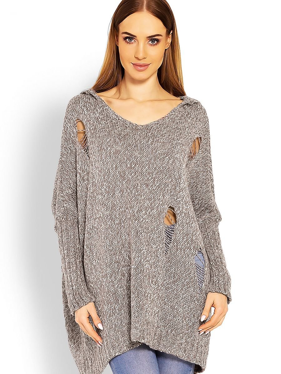 Puchaty sweterek z kapturem. Sweter z ozdobnymi dziurami. Krój oversize z dekoltem w szpic. Sweter z mięciutkiej przędzy.
