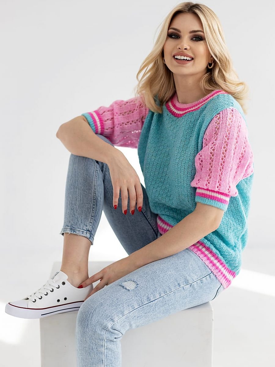 Sweter o luźnym kroju z krótkim rękawkiem. Krótki rękaw z ażurowym wzorem.