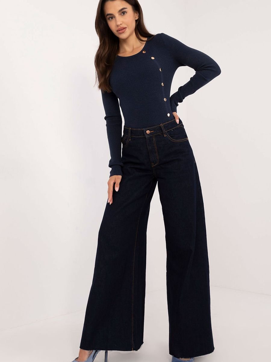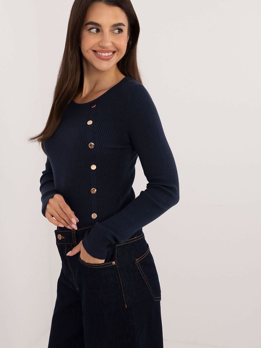 Casualowy damski sweter, idealny na co dzień oraz do pracy. Wykonany z mieszanki wiskozy, poliestru i poliamidu, zapewnia wygodę i trwałość. Gładki, prążkowany materiał podkreśla subtelny, klasyczny charakter swetra, który ma standardową długość i długi rękaw. Okrągły dekolt dodaje mu uniwersalności, a ozdobne guziki na przodzie, biegnące wzdłuż całego swetra, nadają stylowego i eleganckiego akcentu. To świetna propozycja do casualowych stylizacji, łącząca komfort z modnym, kobiecym designem.