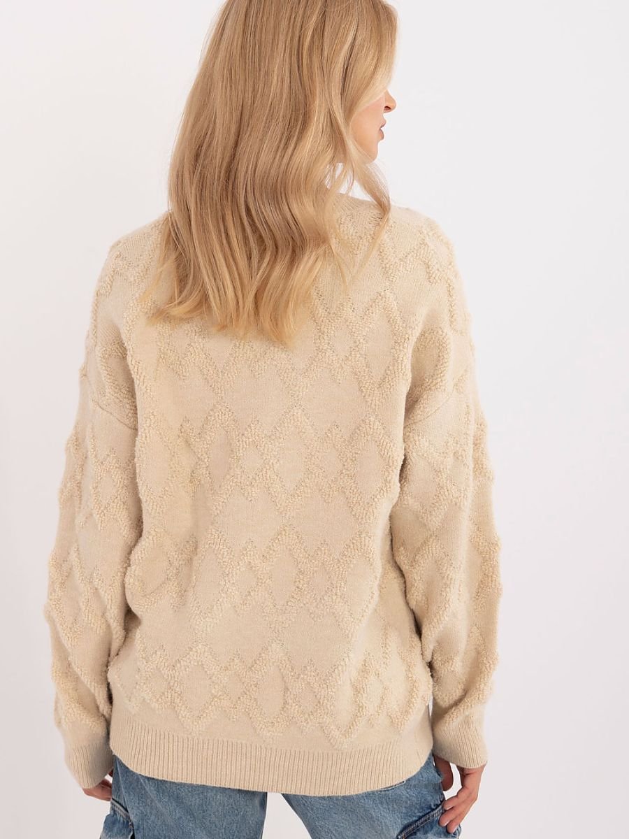 Damski sweter w stylu casual, idealny na codzienne okazje. Charakteryzuje się urozmaiconą fakturą splotu, która dodaje mu subtelnej elegancji. Sweter ma standardową długość i długie rękawy, zapewniając komfort noszenia przez cały dzień. Dekolt okrągły podkreśla klasyczny charakter modelu, który doskonale sprawdzi się zarówno w pracy, jak i na co dzień.