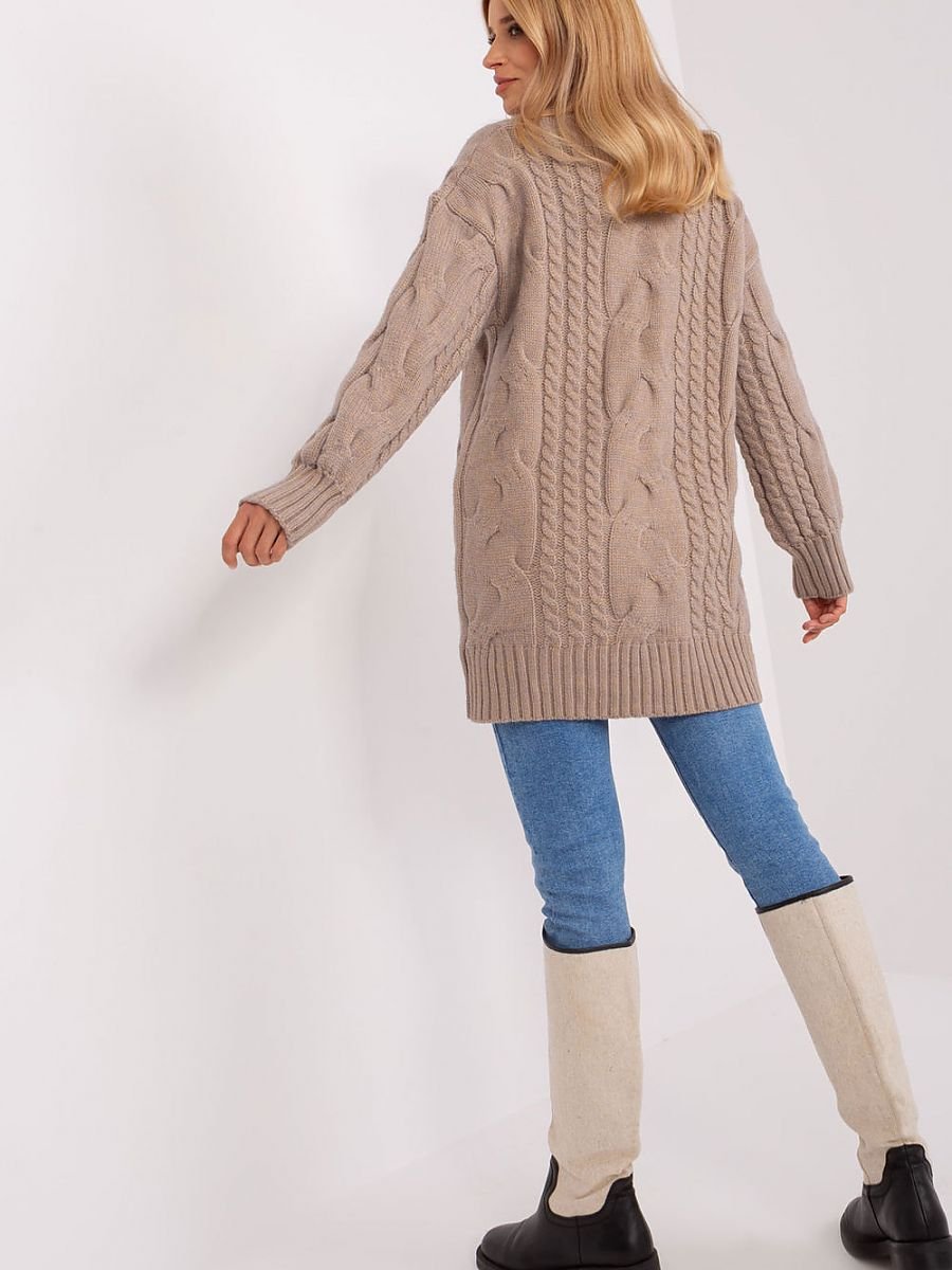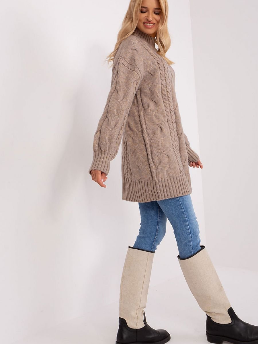 Ten długi sweter to esencja wygody i stylu w jednym. Jego fason to oversize, co oznacza, że ma luźny, szeroki krój, który zapewnia maksymalny komfort. Wzór dominujący to urozmaicona faktura materiału, co nadaje mu wyjątkowego charakteru. Sweter jest wykonany głównie z akrylu, co gwarantuje ciepło i miękkość. Jego długość sięga przed kolano, co sprawia, że jest doskonałym wyborem na chłodniejsze dni. Długi rękaw i bufiasty fason rękawa dodają mu uroku i stylu. Dekolt typu golf nie tylko jest modny, ale także chroni przed wiatrem. To idealny wybór dla tych, którzy cenią wygodę i elegancję. Sweter można również nosić jako krótką sukienkę.
