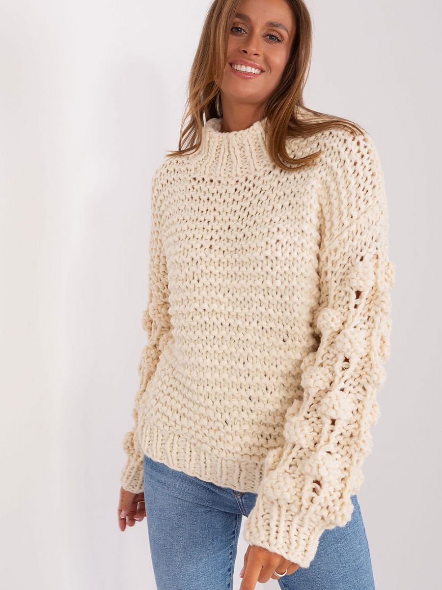 Ten damski sweter to doskonały wybór na wiele okazji. Wykonany z miękkiego poliestru, zapewnia wygodę i komfort noszenia. Sweter ma grubą fakturę splotu, co nadaje mu uniwersalności. Bufiaste rękawy to główna cecha, która przyciąga uwagę i dodaje swetrowi charakteru. Jego standardowa długość sprawia, że jest odpowiedni do noszenia zarówno do spodni, jak i spódnic. Długi rękaw chroni przed chłodem, co czyni go świetnym wyborem na chłodniejsze dni. Sweter ma klasyczny, okrągły dekolt, który jest wygodny i pasuje do różnych stylizacji. Możesz go nosić na co dzień, do pracy, a także na spotkania ze znajomymi czy randki. Bufiaste rękawy to aktualny trend w modzie, dzięki czemu ten sweter nie tylko utrzyma Cię ciepło, ale także pozwoli Ci wyglądać stylowo i trendy.