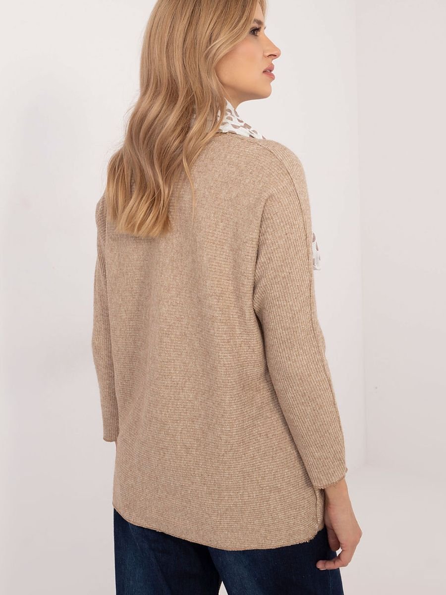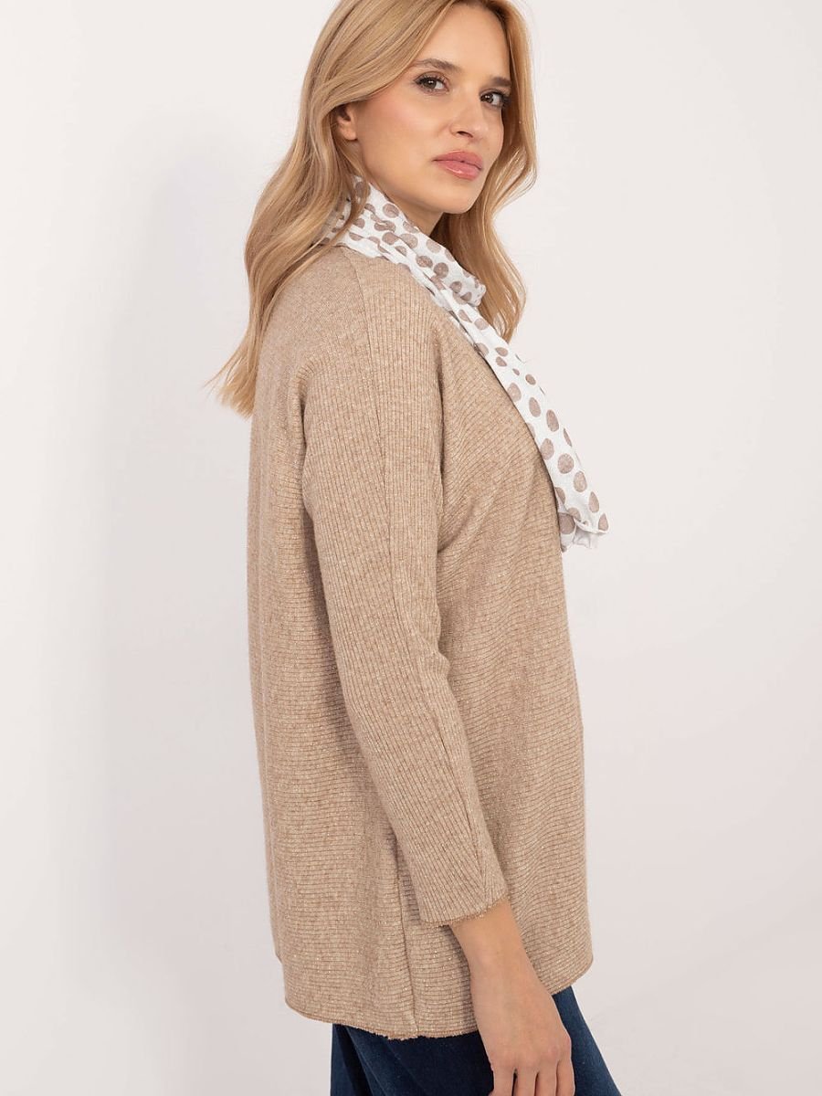 Elegancki damski sweter z subtelną, błyszczącą nitką, który doskonale sprawdzi się zarówno na co dzień, do pracy, jak i podczas wyjątkowych okazji. Gładki wzór podkreśla uniwersalny charakter swetra, a prążkowana faktura dodaje mu nowoczesnego stylu i delikatnej struktury. Wykonany z mieszanki wiskozy i elastanu, zapewnia komfort noszenia i lekko dopasowuje się do sylwetki. Standardowa długość i dekolt w serek tworzą klasyczny wygląd, a brak zapięcia nadaje mu swobodnej elegancji. Długi rękaw doskonale sprawdzi się w chłodniejsze dni. Do zestawu dołączona jest apaszka, która stanowi idealne dopełnienie stylizacji.