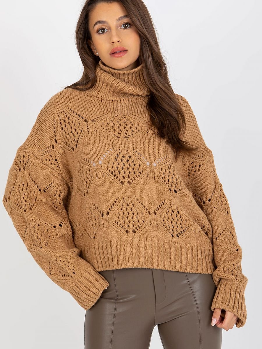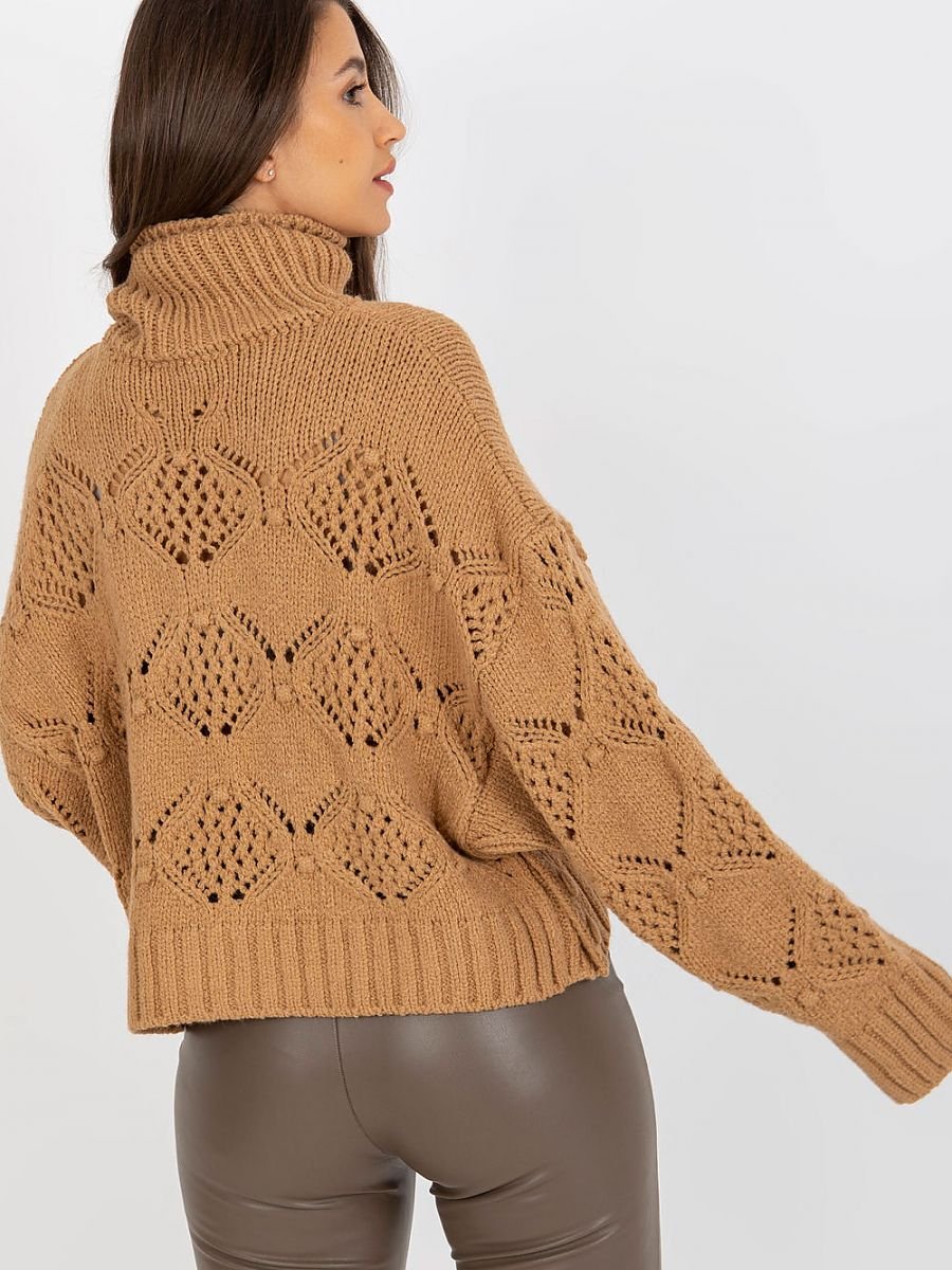Ażurowy sweter z szerokimi rękawami oraz golfem.