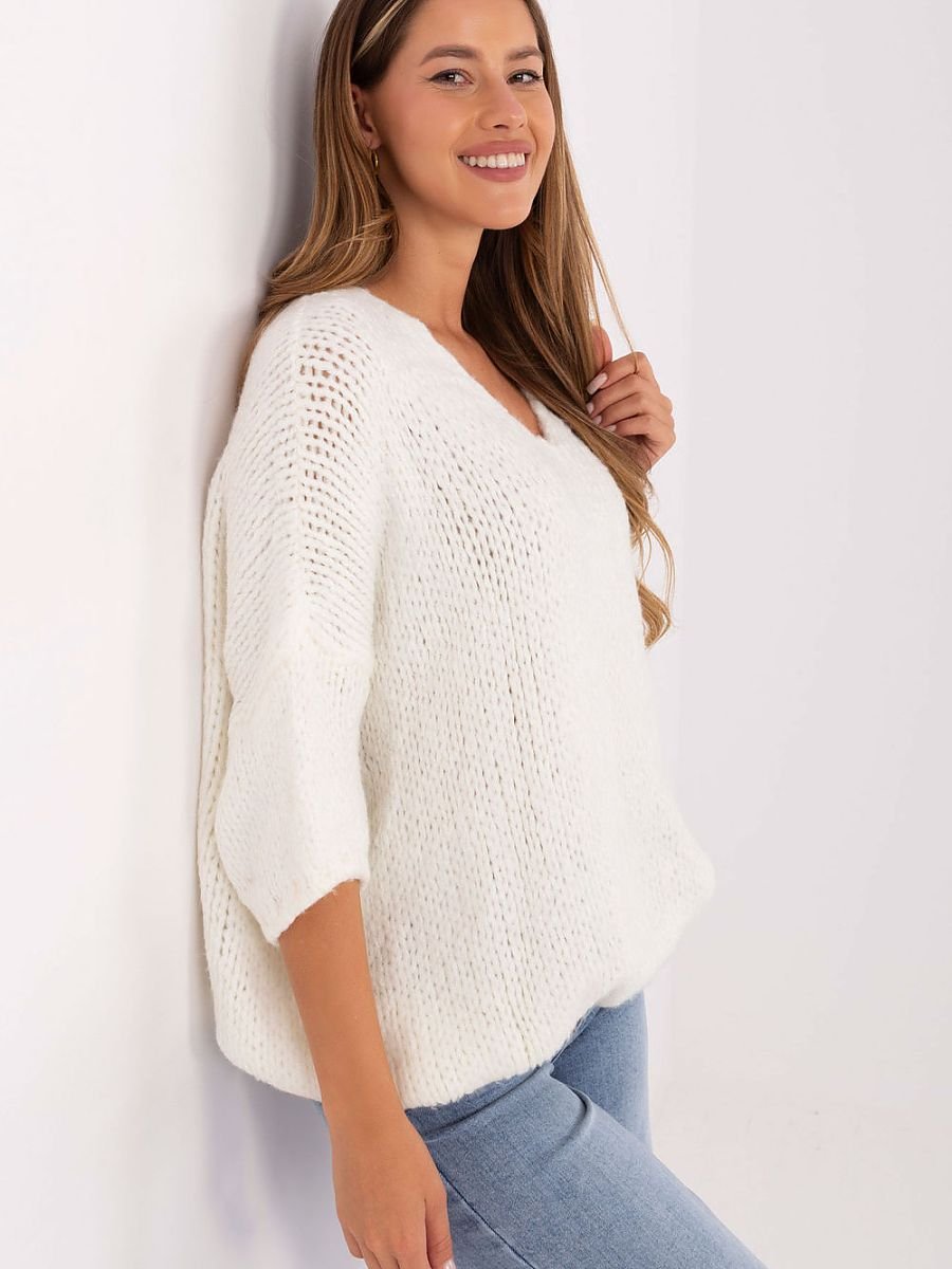 Sweter damski o fasonie oversize, wykonany z mieszanki poliakrylu, alpaki, poliamidu i wiskozy, która gwarantuje miękkość, ciepło oraz wygodę na co dzień. Model ma standardową długość i luźny krój, dzięki czemu doskonale wpisuje się w casualowy styl. Urozmaicona faktura materiału dodaje mu niepowtarzalnego charakteru, a dekolt w serek subtelnie wysmukla sylwetkę. Rękawy o długości 3/4 wprowadzają lekkość i swobodę, a brak zapięcia sprawia, że sweter jest niezwykle praktyczny i łatwy do stylizacji na codzienne okazje.