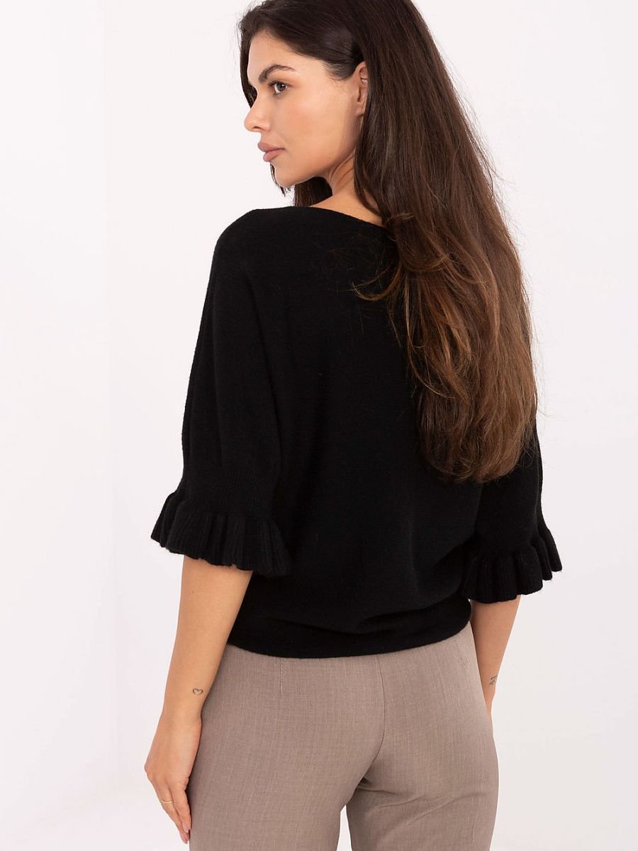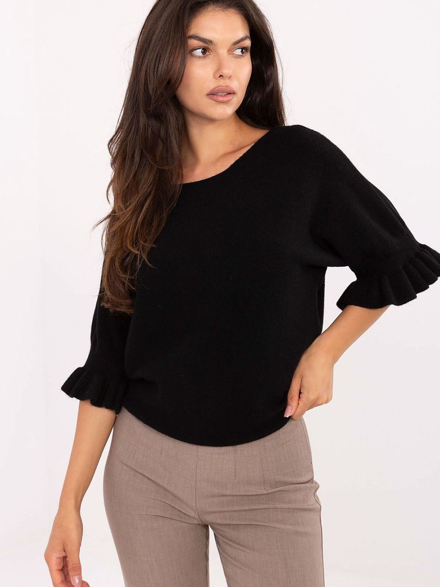 Elegancki damski sweter o standardowej długości, idealny zarówno na co dzień, jak i na bardziej wyjątkowe okazje. Wykonany z wysokiej jakości mieszanki wiskozy, poliestru i nylonu, zapewnia komfort noszenia oraz trwałość. Gładki wzór nadaje mu ponadczasowy charakter, a subtelne detale dodają kobiecego uroku. Model wyróżnia się okrągłym dekoltem oraz rękawami 3/4 zakończonymi delikatną falbaną, które podkreślają elegancję i lekkość stylizacji. To doskonały wybór dla kobiet ceniących klasykę w nowoczesnym wydaniu.