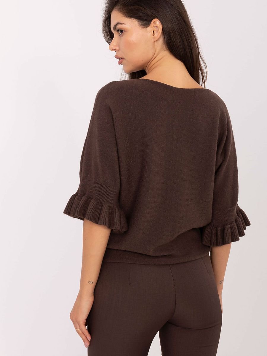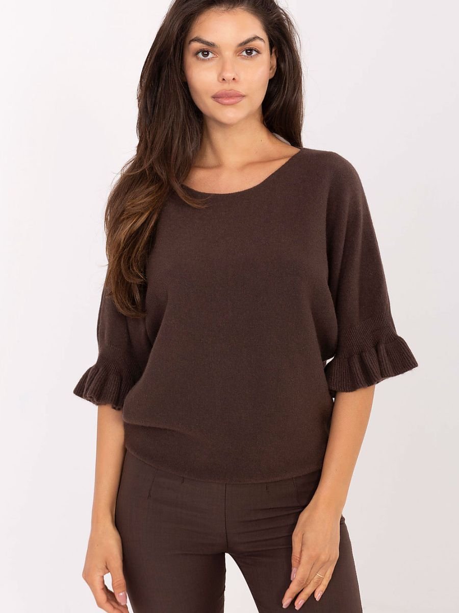 Elegancki damski sweter o standardowej długości, idealny zarówno na co dzień, jak i na bardziej wyjątkowe okazje. Wykonany z wysokiej jakości mieszanki wiskozy, poliestru i nylonu, zapewnia komfort noszenia oraz trwałość. Gładki wzór nadaje mu ponadczasowy charakter, a subtelne detale dodają kobiecego uroku. Model wyróżnia się okrągłym dekoltem oraz rękawami 3/4 zakończonymi delikatną falbaną, które podkreślają elegancję i lekkość stylizacji. To doskonały wybór dla kobiet ceniących klasykę w nowoczesnym wydaniu.