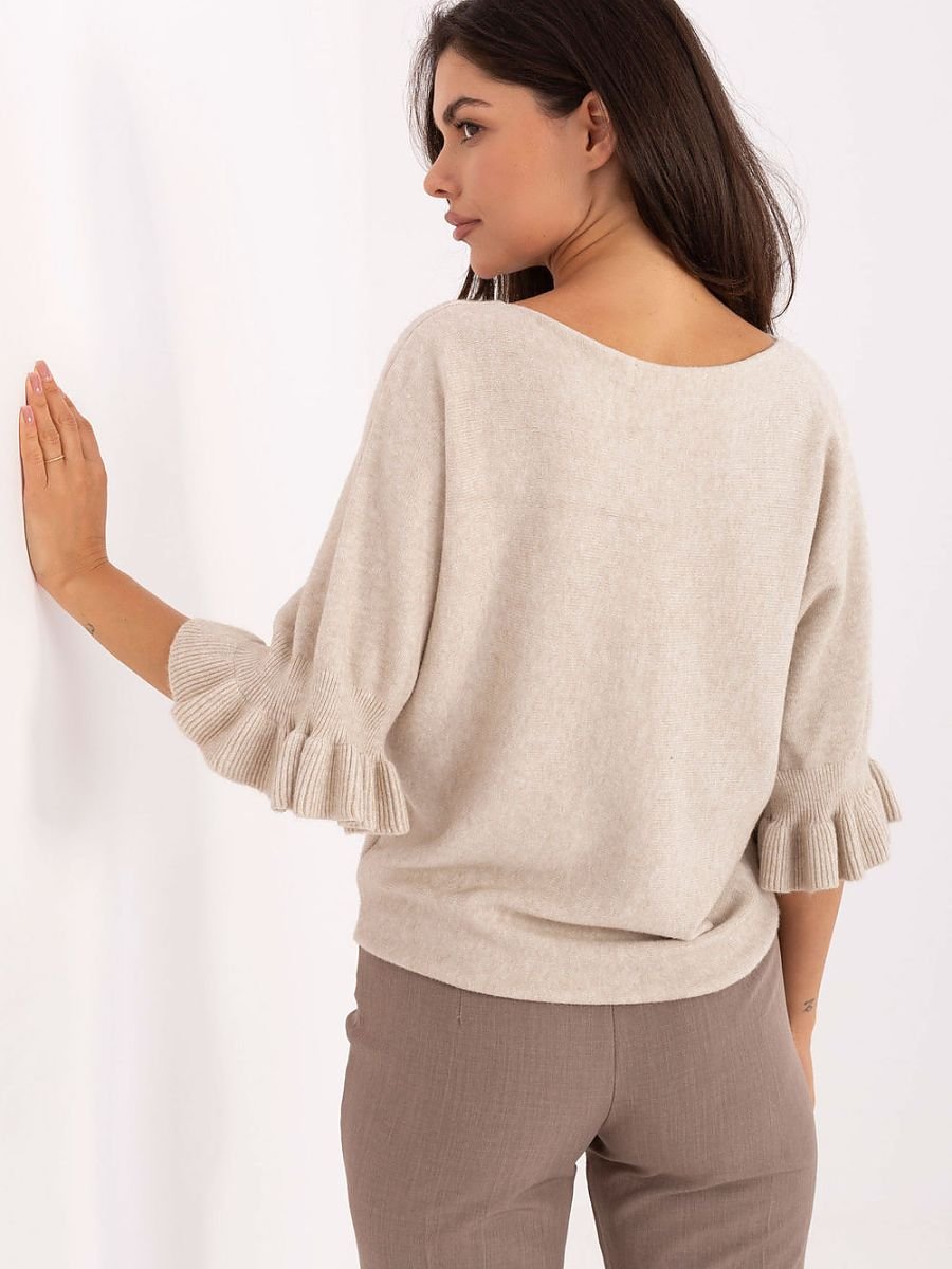 Elegancki damski sweter o standardowej długości, idealny zarówno na co dzień, jak i na bardziej wyjątkowe okazje. Wykonany z wysokiej jakości mieszanki wiskozy, poliestru i nylonu, zapewnia komfort noszenia oraz trwałość. Gładki wzór nadaje mu ponadczasowy charakter, a subtelne detale dodają kobiecego uroku. Model wyróżnia się okrągłym dekoltem oraz rękawami 3/4 zakończonymi delikatną falbaną, które podkreślają elegancję i lekkość stylizacji. To doskonały wybór dla kobiet ceniących klasykę w nowoczesnym wydaniu.