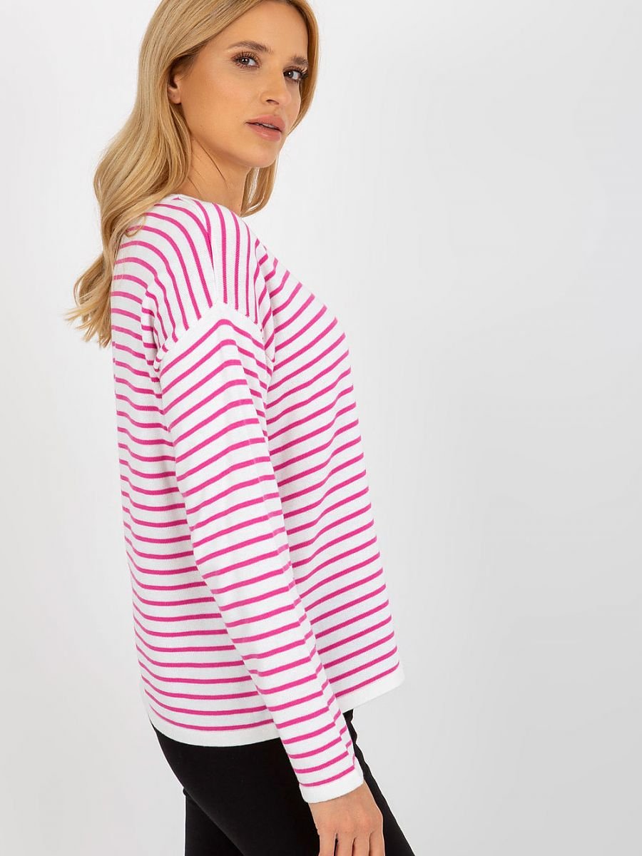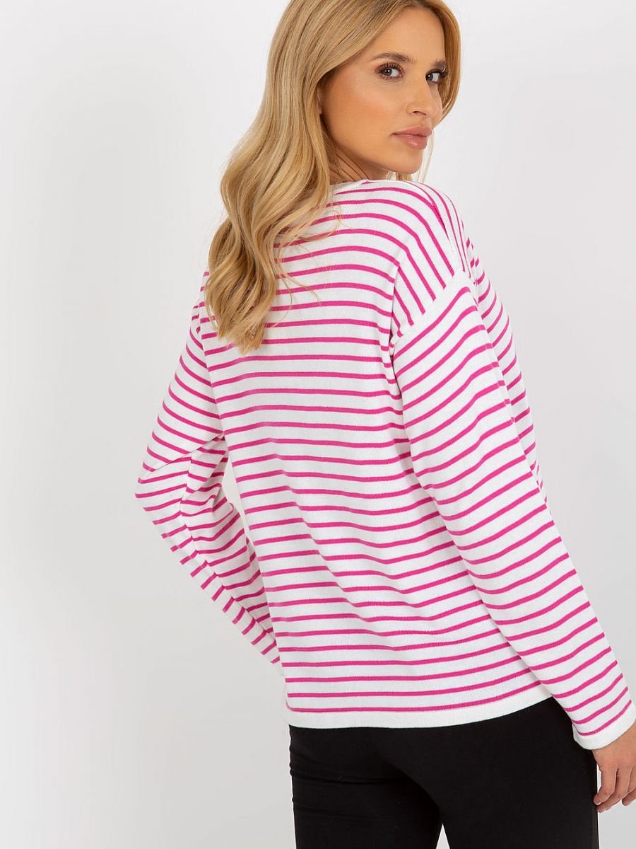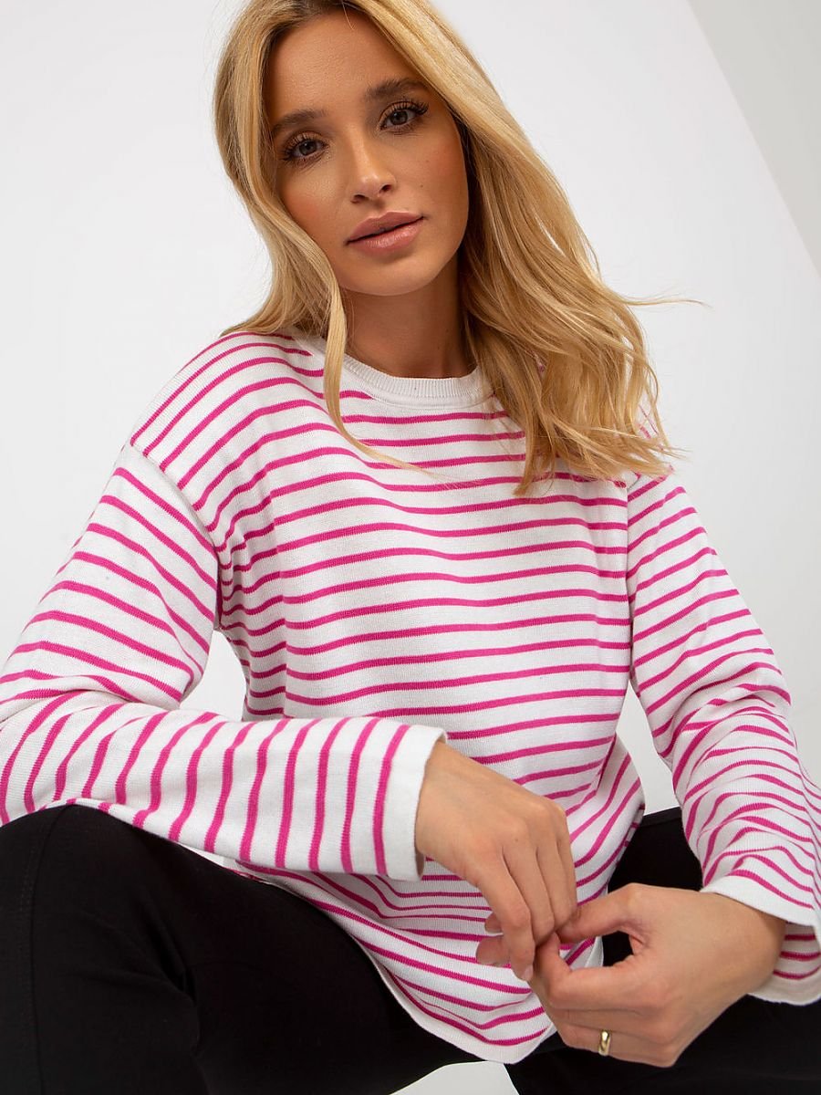 Sweter damski o klasycznym kroju w kolorowe paski, z długim rękawem oraz okrągłym dekoltem.