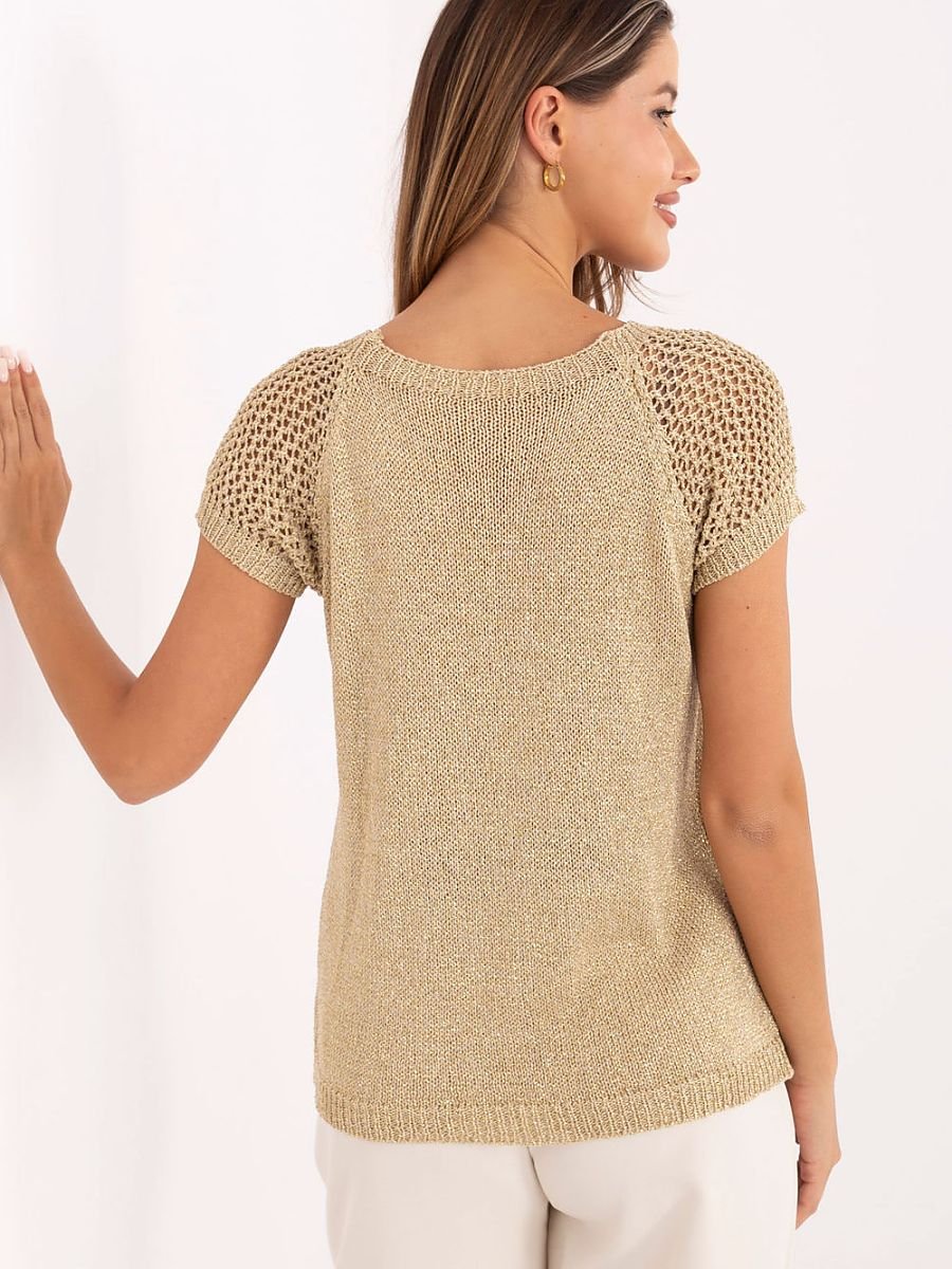 Stylowy i subtelnie elegancki sweter damski to idealna propozycja na co dzień oraz do pracy. Wykonany z przyjemnego w dotyku materiału wiskozy z dodatkiem włókna metalizowanego, delikatnie połyskuje, nadając stylizacji wyjątkowego charakteru, a jednocześnie zachowując komfort i lekkość. Model o standardowej długości, z krótkim rękawem i klasycznym okrągłym dekoltem sprawdzi się zarówno w biurowych stylizacjach, jak i w bardziej casualowych zestawach. Model który z łatwością dopasujesz do spodni, spódnicy czy eleganckich materiałowych szortów. To sweter, który łączy elegancję z codzienną wygodą, dodając blasku każdej stylizacji bez przesady.