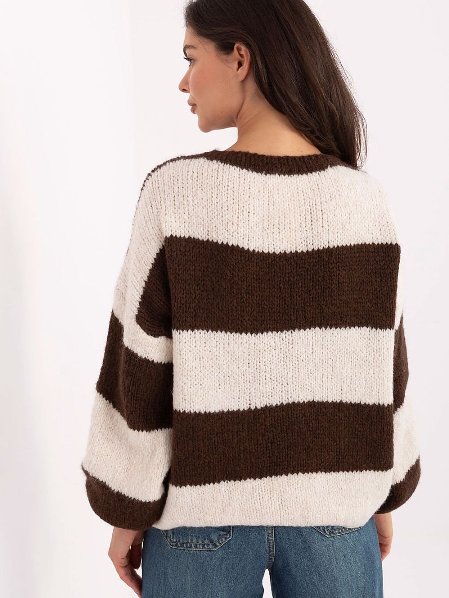 Sweter damski oversize w paski to modna propozycja w stylu casual, stworzona z myślą o codziennym komforcie i wygodzie. Wykonany z mieszanki akrylu, wełny, wiskozy i poliamidu, jest miękki, przyjemny w dotyku i otula ciepłem w chłodniejsze dni. Oversizeowy fason nadaje mu luźnego, nowoczesnego charakteru. Wiązanie na przodzie zamiast tradycyjnych guzików podkreśla oryginalny design. Wzór w paski dodaje energii i świeżości stylizacji. Długi bufiasty rękaw wprowadza subtelny, kobiecy akcent. Okrągły dekolt sprawia, że model prezentuje się klasycznie i ponadczasowo. Standardowa długość pozwala łatwo łączyć go z jeansami, spódnicą czy eleganckimi spodniami. To sweter, który łączy komfort z niebanalnym stylem, idealny do codziennych, luźnych stylizacji.