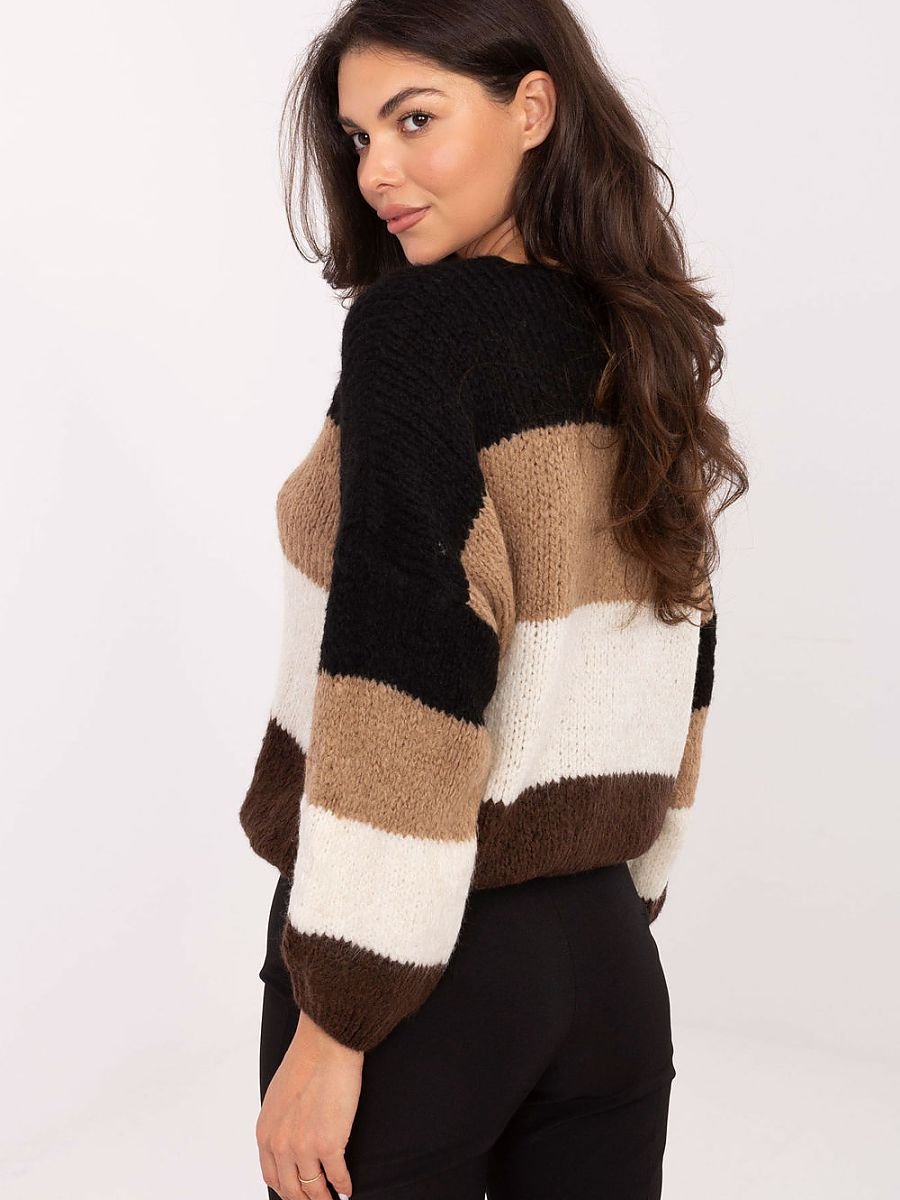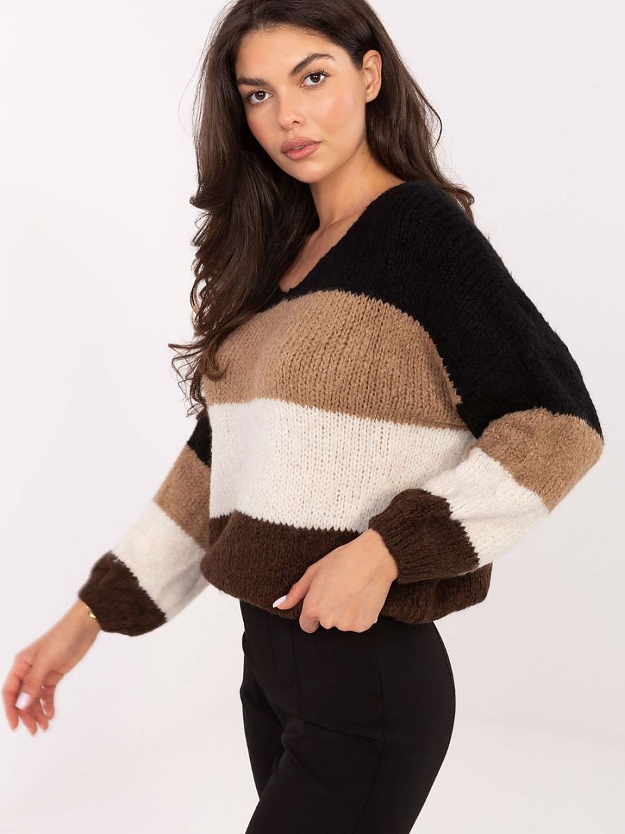 Sweter damski oversize w paski to modna propozycja w stylu casual, idealna zarówno na co dzień, jak i do pracy. Wykonany z mieszanki akrylu, wełny, wiskozy i poliamidu, jest miękki, przyjemny w dotyku i komfortowy w noszeniu. Luźny, oversizeowy fason zapewnia swobodę ruchów i nowoczesny wygląd. Wzór w paski nadaje mu energii i świeżości, doskonale wpisując się w codzienne stylizacje. Standardowa długość i długi rękaw sprawiają, że sweter jest praktyczny i wygodny. Dekolt w serek wysmukla szyję i podkreśla kobiecą sylwetkę. To uniwersalny model, który świetnie sprawdzi się w zestawieniu z jeansami, spódnicą czy eleganckimi spodniami, dodając lekkości i swobodnego charakteru każdej stylizacji.