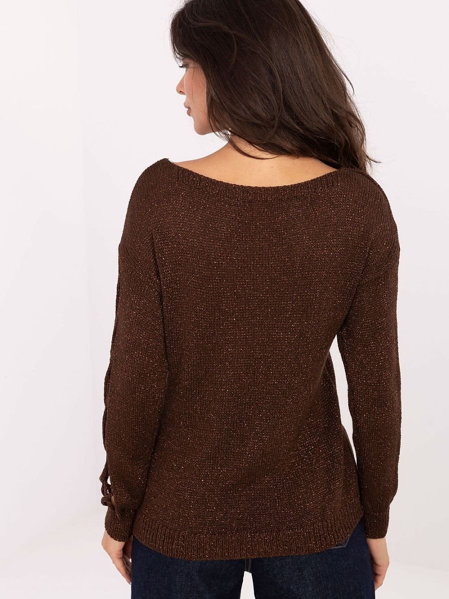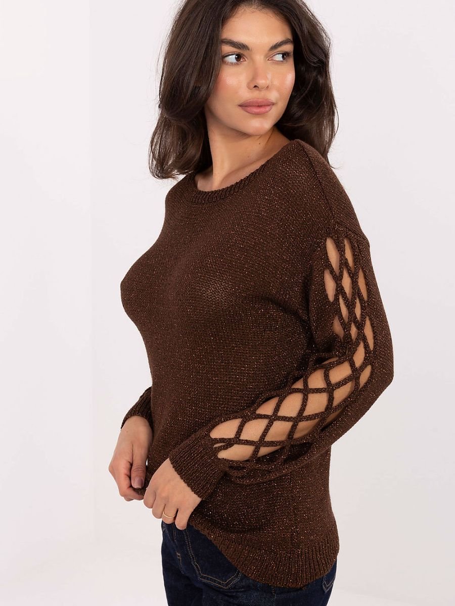 Elegancki sweter damski o standardowej długości, wykonany z wysokiej jakości wiskozy z dodatkiem przędzy metalizowanej, która subtelnie połyskuje i dodaje całości wyjątkowego charakteru. Model wyróżnia się modnymi wycięciami na rękawach, dzięki czemu klasyczna forma zyskuje nowoczesny akcent. Gładki wzór sprawia, że sweter jest uniwersalny i łatwy do łączenia z innymi elementami garderoby. Długi rękaw oraz okrągły dekolt nadają mu ponadczasowej elegancji, a jednocześnie zapewniają komfort noszenia. Doskonale sprawdzi się zarówno na co dzień, jak i w stylizacjach do pracy, podkreślając kobiecy szyk w prosty, a zarazem efektowny sposób.