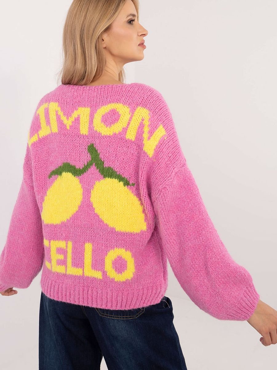 Damski sweter casual idealny na codzienne okazje. Charakteryzuje się oryginalnym nadrukiem umieszczonym na plecach oraz subtelnym, małym nadrukiem na przodzie, co nadaje mu wyjątkowego stylu. Wykonany z połączenia akrylu, wiskozy, lany i poliamidu, co sprawia, że jest miękki, ciepły i trwały. Posiada standardową długość oraz długi rękaw, a dekolt w serek dodaje elegancji i kobiecości. Sweter zapinany jest na guziki, co czyni go praktycznym i wygodnym w codziennym użytkowaniu. Świetnie sprawdzi się w casualowych stylizacjach.