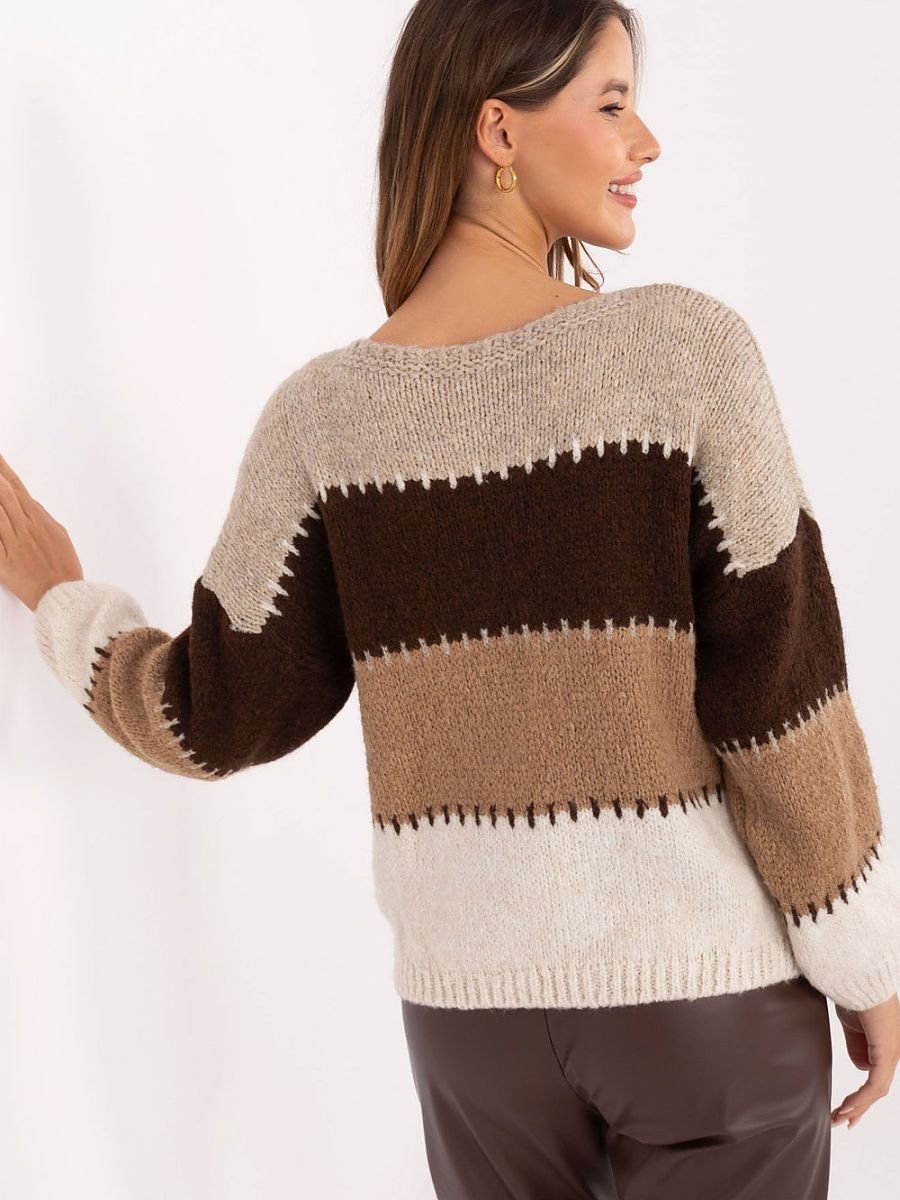 Stylowy sweter damski o luźnym kroju to idealny wybór na co dzień. Wykonany z miękkiej mieszanki materiałów akrylu, poliamidu, wiskozy i wełny zapewnia komfort noszenia oraz przyjemne ciepło w chłodniejsze dni. Model ma standardową długość, długie rękawy i okrągły dekolt, dzięki czemu doskonale dopasowuje się do sylwetki i pasuje do wielu stylizacji. Wzór w paski nadaje mu modnego, casualowego charakteru, idealnego do noszenia na co dzień do jeansów, spodni materiałowych czy spódnic. Ten sweter to doskonała propozycja na codzienne, niezobowiązujące okazje, gdy chcesz wyglądać stylowo i czuć się swobodnie.