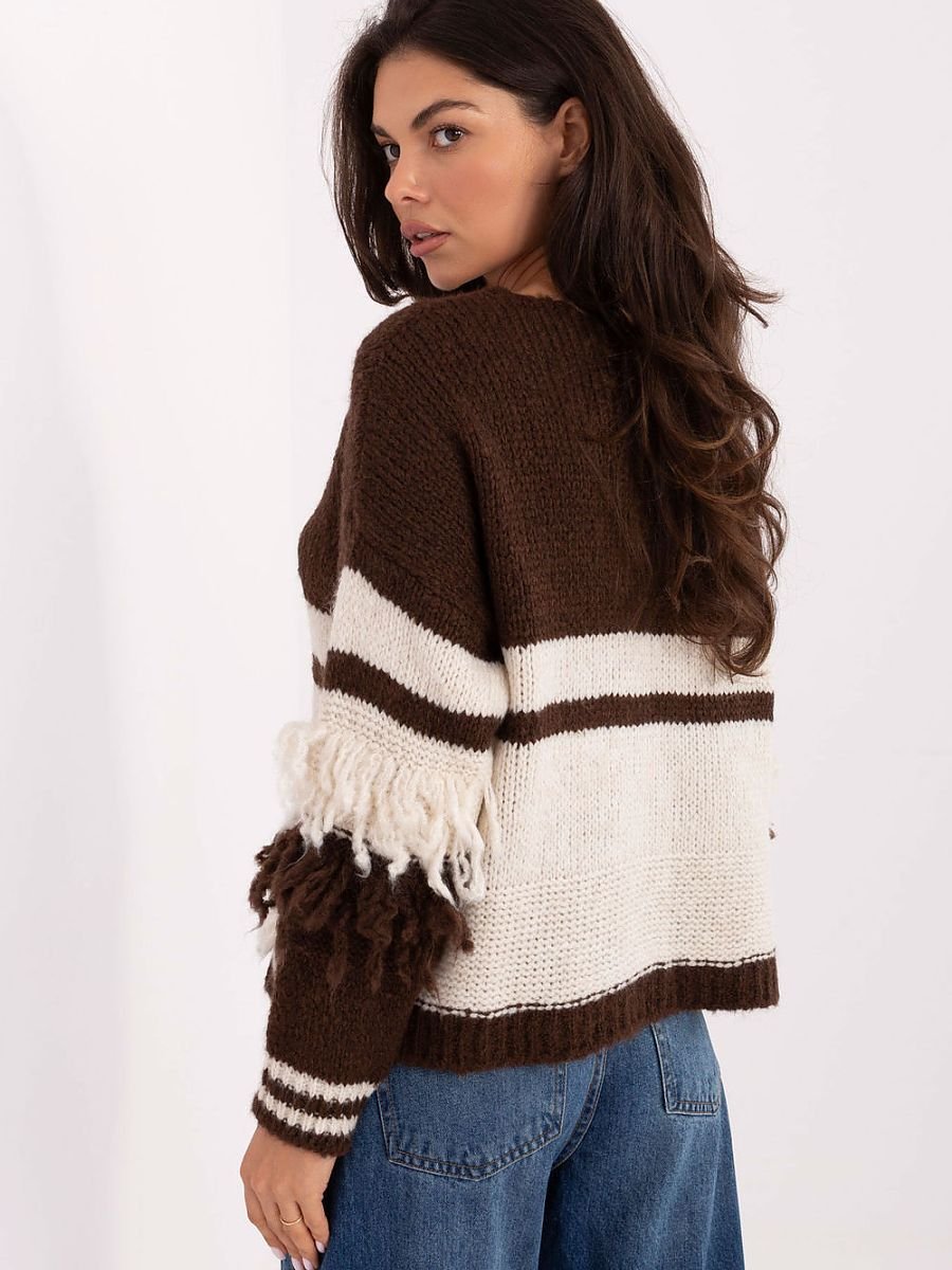 Dwukolorowy sweter damski to modny element garderoby w stylu casual, idealny na codzienne wyjścia i różne okazje. Wykonany z mieszanki poliakrylu, poliamidu, wełny i wiskozy, zapewnia ciepło, komfort i przyjemność noszenia. Dekolt w serek oraz zapięcie na ozdobne guziki dodają mu eleganckiego charakteru. Długi rękaw i standardowa długość gwarantują wygodę noszenia. Frędzle na przodzie i rękawach wprowadzają oryginalny, lekko boho akcent, nadając swetrowi wyjątkowego stylu. To sweter, który łączy komfort, funkcjonalność i modny design, idealny do casualowych i stylowych zestawień.