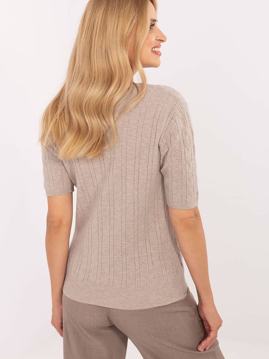 Casualowy sweter damski wykonany z elastycznej mieszanki wiskozy, poliestru i poliamidu, który zapewnia komfort i lekkość noszenia. Dekolt w serek nadaje sylwetce subtelnej elegancji, a krótki rękaw sprawia, że sweter doskonale sprawdza się w codziennych stylizacjach oraz do pracy. Urozmaicona faktura materiału dodaje całości interesującego charakteru, a standardowa długość pozwala na łatwe łączenie swetra z różnymi spodniami i spódnicami. Model bez zapięcia, prosty i uniwersalny, idealny do casualowych i biznesowych outfitów.