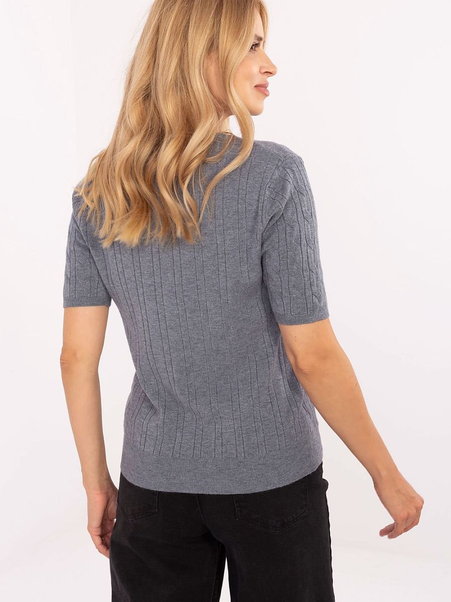 Casualowy sweter damski wykonany z elastycznej mieszanki wiskozy, poliestru i poliamidu, który zapewnia komfort i lekkość noszenia. Dekolt w serek nadaje sylwetce subtelnej elegancji, a krótki rękaw sprawia, że sweter doskonale sprawdza się w codziennych stylizacjach oraz do pracy. Urozmaicona faktura materiału dodaje całości interesującego charakteru, a standardowa długość pozwala na łatwe łączenie swetra z różnymi spodniami i spódnicami. Model bez zapięcia, prosty i uniwersalny, idealny do casualowych i biznesowych outfitów.