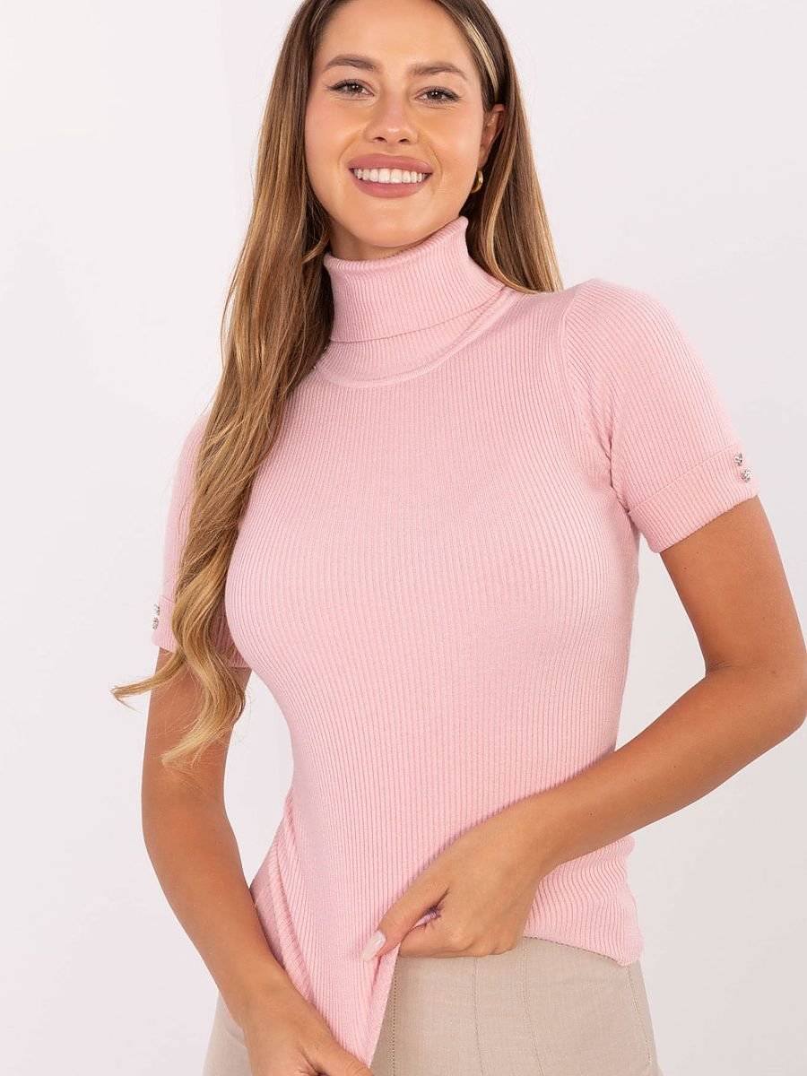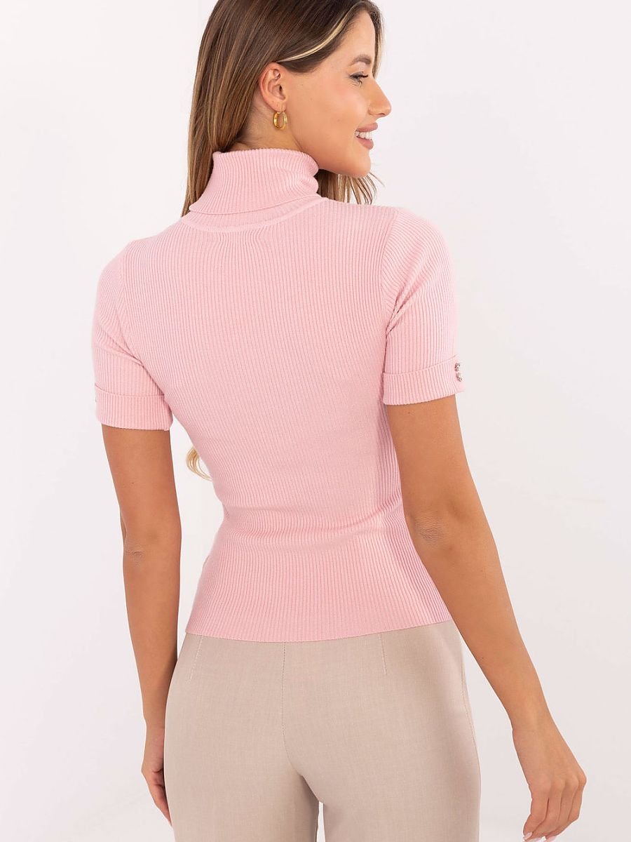 Elegancki sweter damski wykonany z elastycznej mieszanki wiskozy, poliamidu i poliestru, która zapewnia komfort i swobodę ruchów. Gładki, prążkowany materiał nadaje mu subtelnej struktury, a klasyczny golf podkreśla szyję i dodaje wyrafinowanego charakteru. Krótki rękaw sprawia, że sweter świetnie sprawdza się zarówno w codziennych, jak i biznesowych stylizacjach, a ozdobne guziki na rękawkach dodają modnego akcentu. Model bez zapięcia, w standardowej długości, idealny do spódnic, spodni czy eleganckich garniturowych zestawów.