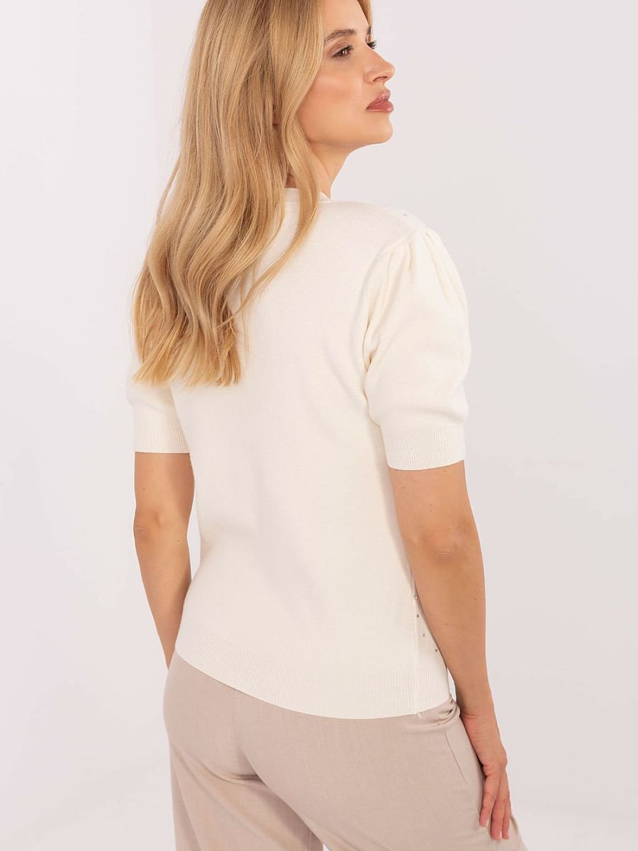 Elegancki sweter damski z krótkimi, bufiastymi rękawami to stylowa propozycja do pracy i na co dzień. Wykonany z miękkiej mieszanki wiskozy, poliestru i nylonu, zapewnia komfort noszenia oraz elegancki wygląd. Model o standardowej długości z okrągłym dekoltem wyróżnia się ozdobnymi dżetami na całym przodzie, które dodają mu wyjątkowego, efektownego charakteru. Idealny do zestawienia zarówno ze spódnicami, jak i eleganckimi spodniami, tworząc modne codzienne lub biurowe stylizacje.