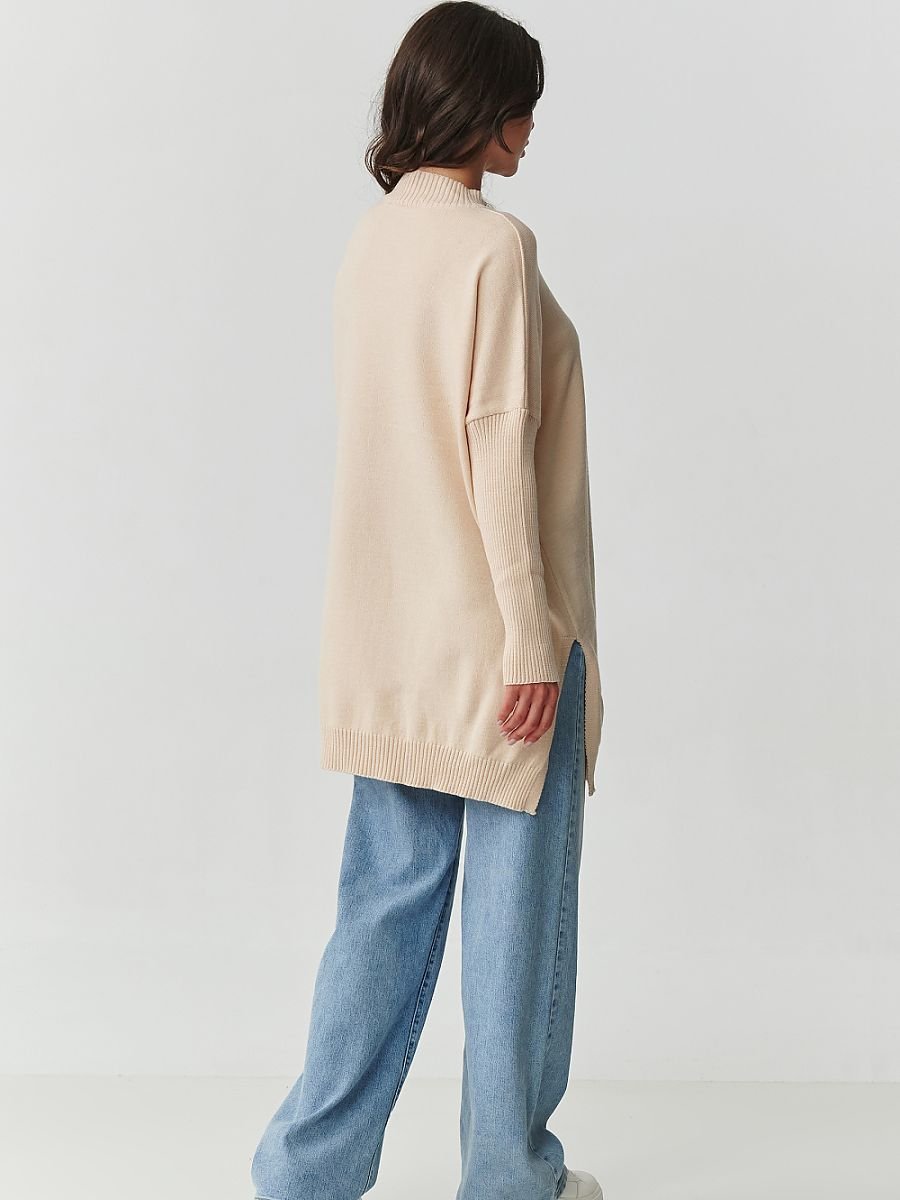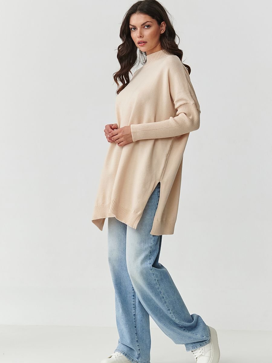 Sweter damski oversize z przewagą wiskozy to kwintesencja wygody i kobiecej elegancji w codziennym wydaniu. Miękki, delikatny materiał otula ciało niczym druga skóra, zapewniając komfort przez cały dzień niezależnie od okazji. Dzięki oversizeowemu fasonowi i subtelnym rozcięciom po bokach, sweter pięknie układa się na sylwetce, dodając jej lekkości i swobody. Półgolf nie tylko podkreśla szyję, ale też nadaje całości nowoczesny, wyrafinowany charakter. To idealna propozycja dla kobiet, które cenią sobie połączenie prostoty i stylu, świetnie komponuje się zarówno z jeansami, jak i eleganckimi spodniami czy legginsami. Ten model stanie się Twoim ulubionym towarzyszem chłodniejszych dni, otulając Cię miękkością i subtelną elegancją.