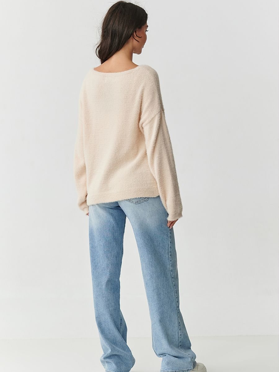 Sweter damski wykonany w 100% z poliamidu to propozycja, która łączy nowoczesny design z wyjątkową wygodą. Miękki i puszysty w dotyku materiał sprawia, że sweter otula ciało niczym delikatny koc, zapewniając przyjemne ciepło w chłodniejsze dni. Luźny fason z lekko opuszczoną linią ramion dodaje mu lekkości i swobodnego charakteru, dzięki czemu świetnie wpisuje się zarówno w casualowe, jak i bardziej eleganckie stylizacje. Klasyczny dekolt w łódkę dodatkowo podkreśla kobiecą linię ramion i szyi a szerokie rękawy wykończone subtelnym ściągaczem zapewniają komfort noszenia przez cały dzień. Idealny do jeansów, spódnicy czy legginsów to model, który szybko stanie się bazą Twojej garderoby. Sweter dostępny jest w trzech modnych kolorach: jasny szary, brudny róż oraz jasny beż, wszystkie odcienie są ponadczasowe, kobiece i bardzo uniwersalne..