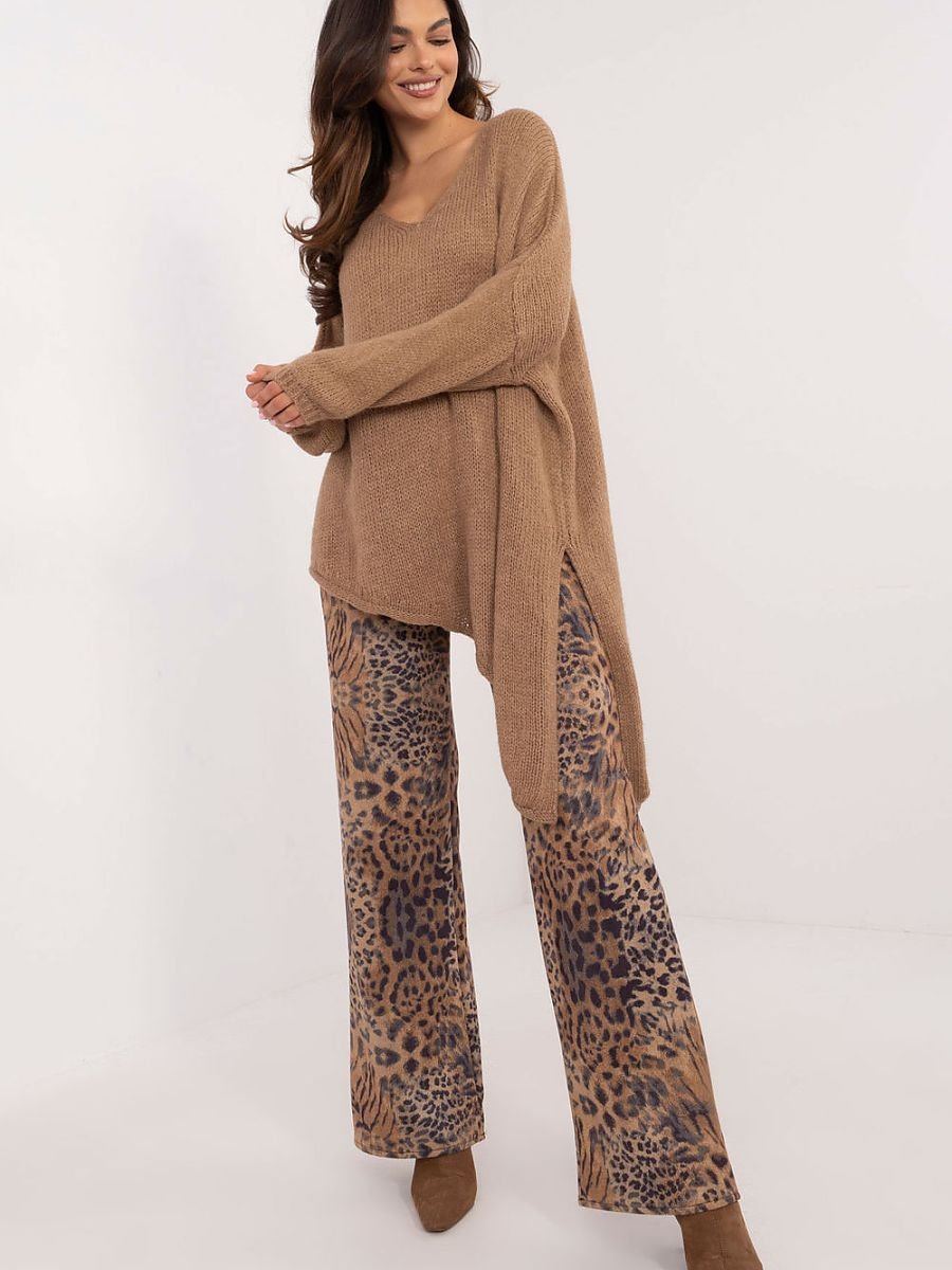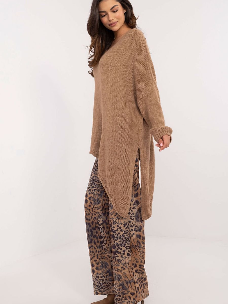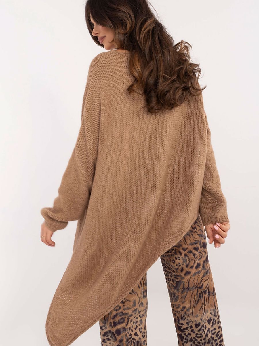 Damski sweter o casualowym charakterze, idealny na co dzień. Wykonany z mieszanki wysokiej jakości materiałów, takich jak poliakryl, wiskoza, wełna i poliamid, zapewnia komfort i przyjemne ciepło. Gładki wzór dominuje w designie, nadając mu uniwersalny i elegancki wygląd. Sweter ma asymetryczny dół, co dodaje mu nowoczesnego, niebanalnego charakteru. Długi fason oraz długi rękaw sprawiają, że jest idealny na chłodniejsze dni. Dekolt w serek subtelnie eksponuje szyję, dodając stylizacji lekkości. Doskonały wybór na codzienne okazje, łączący wygodę z modnym wyglądem.