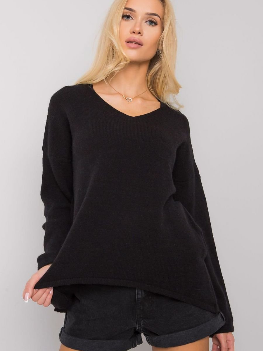 Czarny sweter oversize z długim rękawem.