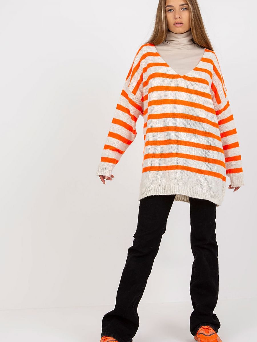 Sweter damski w kolorowe paski, z długim rękawem oraz dekoltem w serek.