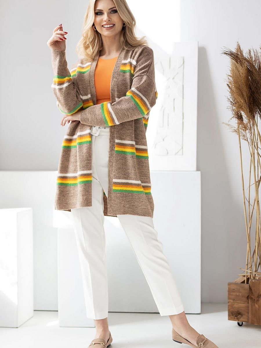 Kardigan o luźnym kroju bez zapięcia, z długim rękawem. Sweter w kolorowe paski.