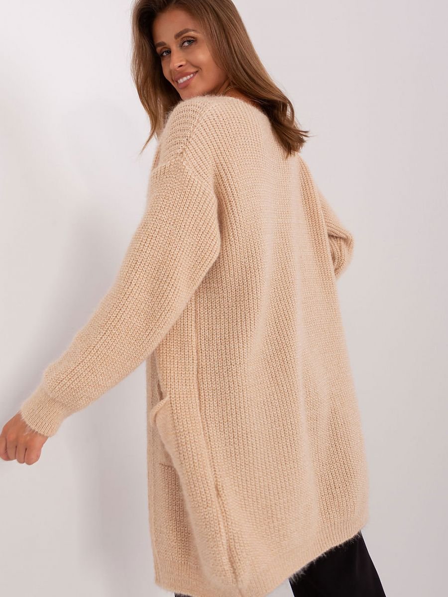 Ten kardigan to doskonały wybór na co dzień. Wykonany z wysokiej jakości akrylu, jest nie tylko przyjemny w noszeniu, ale także trwały. Ma długi rękaw, który zapewnia ciepło w chłodniejsze dni. Kardigan nie ma zapięcia, co nadaje mu swobodny i luźny charakter. Po bokach posiada praktyczne kieszenie wsuwane, które są zarówno wygodne, jak i stylowe. Jego gładki wzór sprawia, że pasuje do wielu różnych stylizacji. Długość swetra sięga przed kolano, co dodaje mu elegancji i nadaje się idealnie do noszenia na co dzień. To must-have w szafie każdej osoby ceniącej komfort i styl.