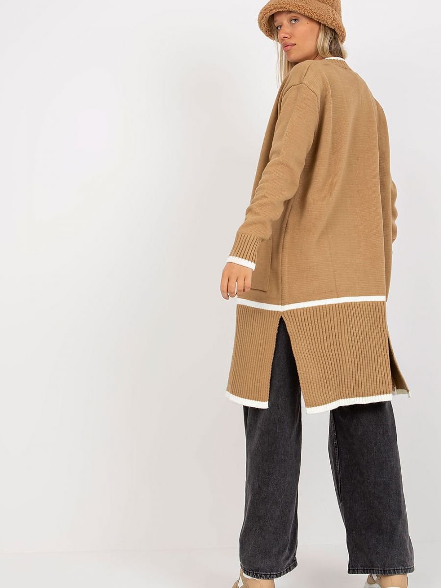 Kardigan damski z długim rękawem, bez zapięcia. Po bokach duże kieszenie wsuwane.