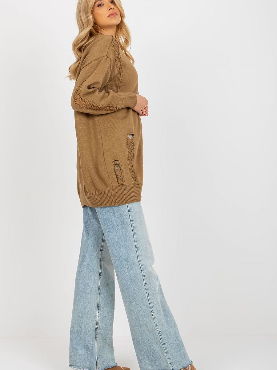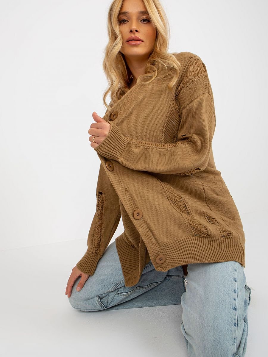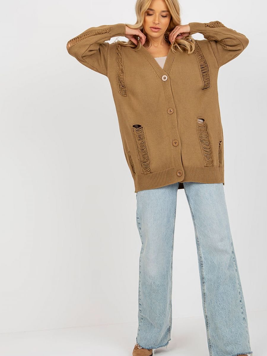 Kardigan zapinany na guziki z długim rękawem. Sweter z dekoltem w serek oraz ozdobnymi dziurami.