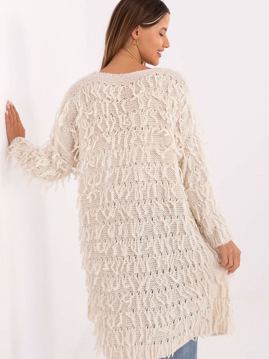 Kardigan damski o casualowym charakterze, idealny na codzienne okazje. Wykonany z miękkiej i przyjemnej w dotyku mieszanki poliakrylu, poliamidu, wiskozy i wełny, zapewnia ciepło i komfort noszenia. Model bez zapięcia o długości przed kolano posiada długie rękawy, a jego urozmaicona faktura materiału w połączeniu z dekoracyjnymi frędzlami na całej powierzchni nadaje kardiganowi lekkości i modnego, swobodnego charakteru. Doskonały do warstwowych stylizacji w stylu casual.