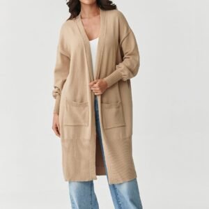 Długi sweter damski z dekoltem w serek, utkany na luźnych oczkach, z kieszeniami umiejscowionymi z przodu. Sweter zapinany jest na dwa duże guziki. Model jest klasyczny i lekko inspirowany stylem retro. Doskonale nadaje się do noszenia ze spodniami, jak i sukienką. Można założyć go do spódnicy tiulowej oraz masywnych kozaków. Sprawdzi się w stylizacjach casualowych, jak i bardziej formalnych. Sweter wykonany jest z włóczki łączącej wełnę z domieszką syntetyków, które zwiększają komfort noszenia i sprzyjają łatwej pielęgnacji. Rękawy zakończone są ściągaczami.