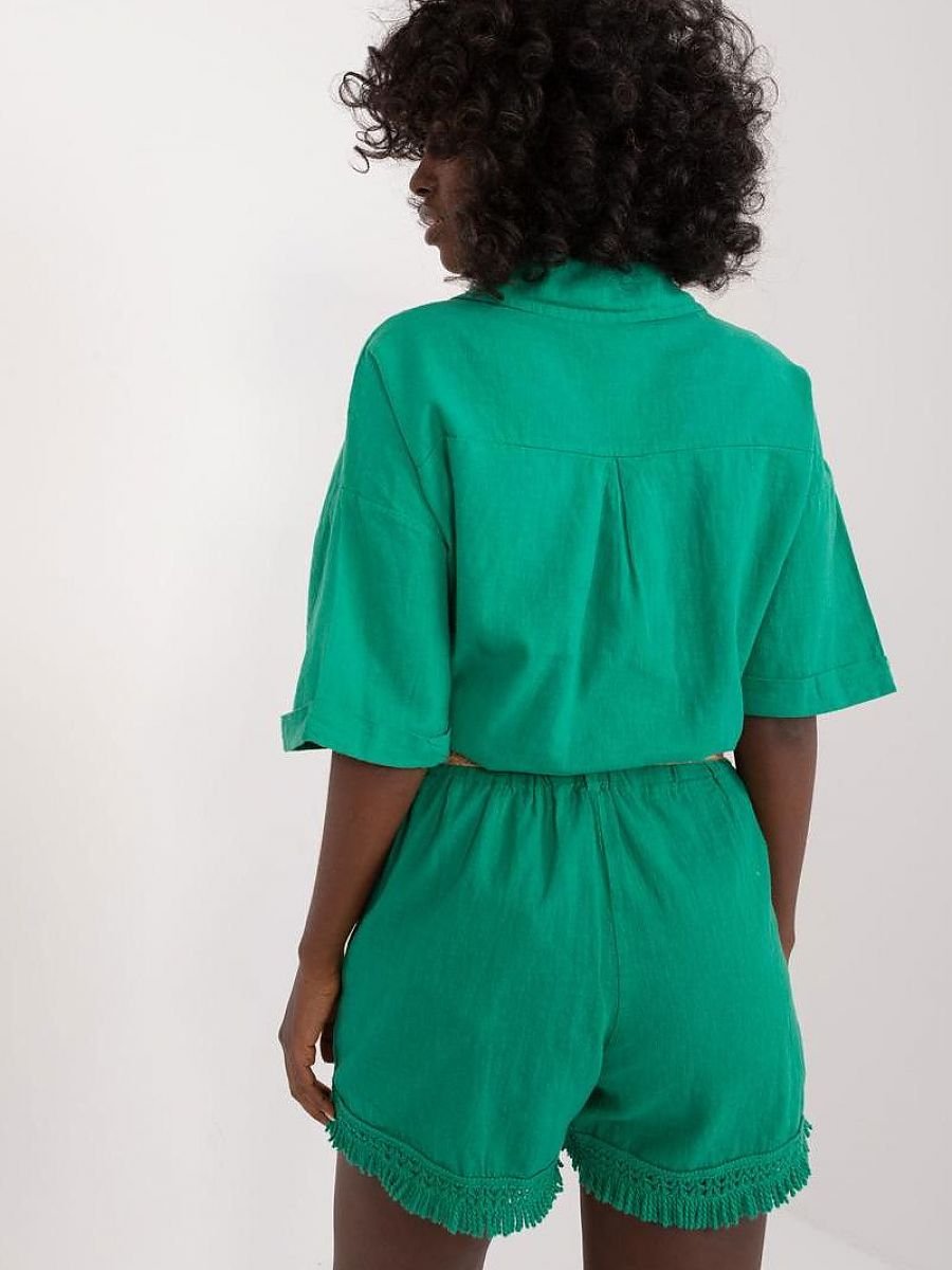 Te materiałowe szorty są idealnym wyborem na codzienne letnie stylizacje, dodając casualowego uroku każdej outfitowi. Wykonane z lekkiego lnu z dodatkiem bawełny, zapewniają przewiewność i komfort noszenia nawet w najgorętsze dni. Ich szerokie nogawki zakończone frędzlami dodają im charakteru i lekkości, nadając oryginalnego wyglądu całej stylizacji. Stylizowane w casualowym duchu, te szorty pasują do wielu różnych outfitów. Materiał w jednolitym kolorze sprawia, że są uniwersalne i łatwe do zestawienia z innymi elementami garderoby. Dodatkowo, ich wysoki stan podkreśla talię i dodaje kobiecego wyrazu. Szorty wyposażone są w zapinany pasek, który umożliwia dopasowanie ich do sylwetki. Idealne na codzienne spacery, spotkania z przyjaciółmi czy letnie wyjścia, te szorty będą doskonałym uzupełnieniem Twojej letniej garderoby, zapewniając styl i komfort przez cały dzień.