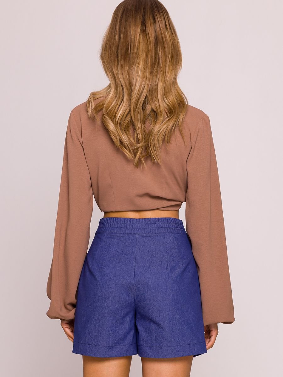Krótki fason, naturalna tkanina i przemyślane detale, te szorty to idealne połączenie wygody i casualowej elegancji. Uszyte z bawełnianej tkaniny o matowym wykończeniu, zapewniają komfort noszenia nawet w najcieplejsze dni. Model z wysokim stanem i elastycznym tyłem pasa, z przodu uzupełniony ozdobnymi zakładkami, które subtelnie podkreślają talię. Szorty zapinane są na kryty zamek oraz dwa dyskretne guziki, co gwarantuje wygodne i estetyczne dopasowanie. Po bokach znajdują się praktyczne, wsuwane kieszenie, a lekko rozszerzane nogawki nadają sylwetce lekkości. Zaprojektowano i uszyto w Polsce, z myślą o funkcjonalności i stylu.