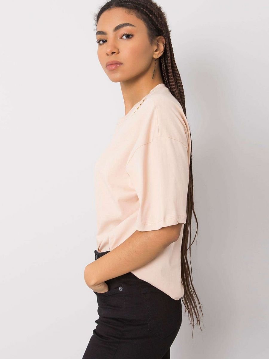 Tshirt damski o luźnym kroju, z krótkim rękawkiem oraz okrągłym dekoltem. Na przodzie ozdobny łańcuszek.