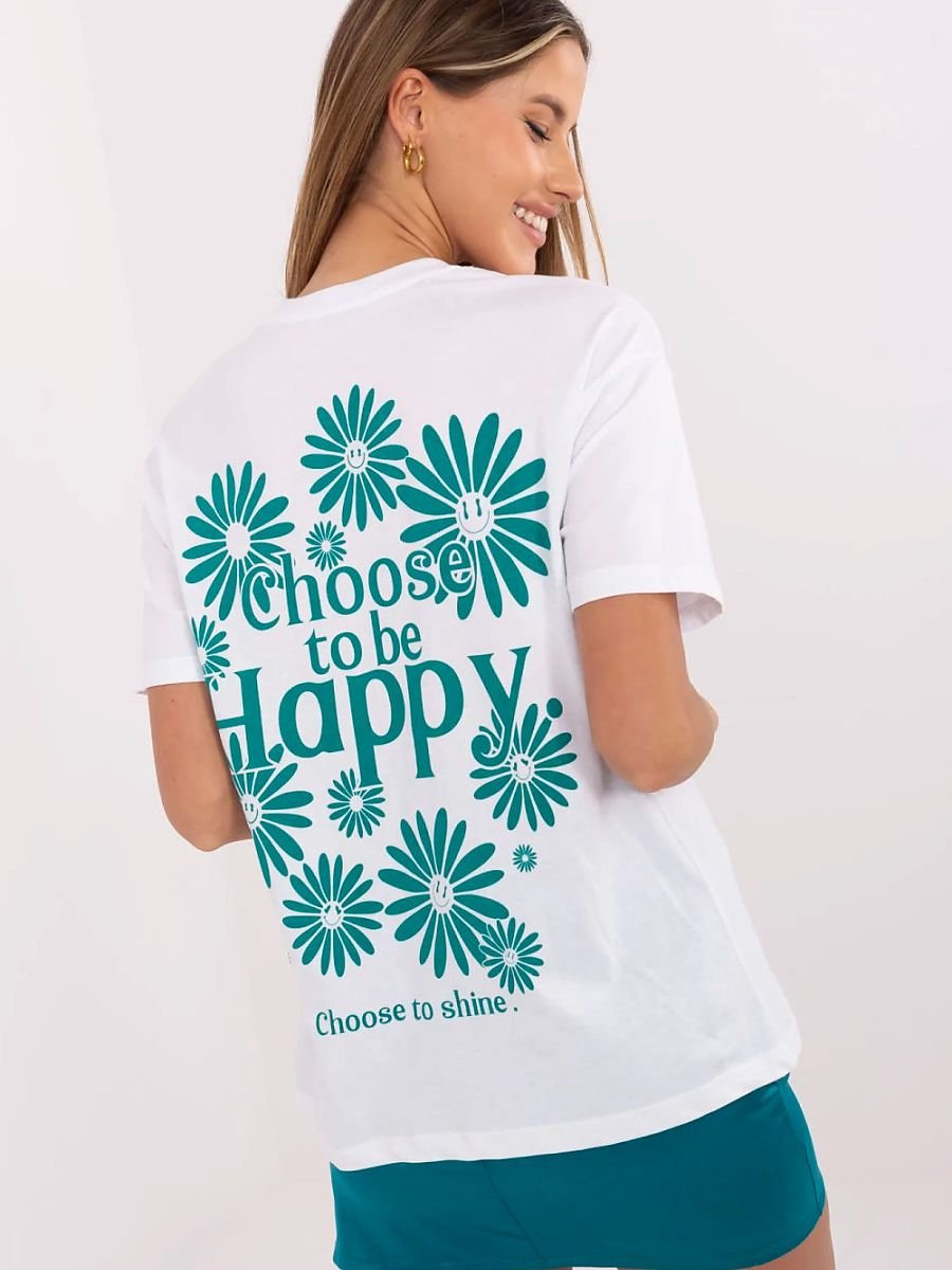 Damski T-shirt w stylu casual to uniwersalna propozycja na co dzień. Wykonany z wysokiej jakości bawełny, zapewnia komfort i swobodę ruchów przez cały dzień. Model o standardowej długości, z klasycznym okrągłym dekoltem i krótkimi rękawami. Z przodu subtelny, niewielki nadruk dodaje delikatnego akcentu, natomiast tył przyciąga wzrok wyrazistym nadrukiem z napisami. Idealny do jeansów, szortów czy spódnicy, świetnie sprawdzi się w miejskich, luźnych stylizacjach.