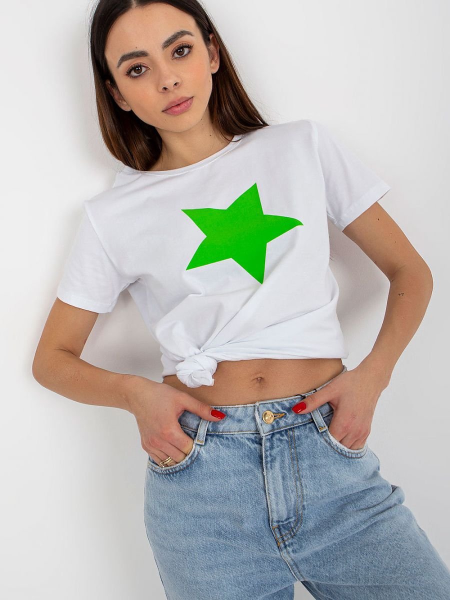 Koszulka damska z krótkim rękawkiem oraz okrągłym dekoltem. Na przodzie ozdobny nadruk.