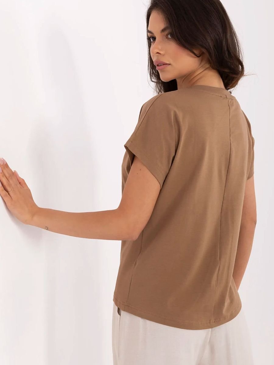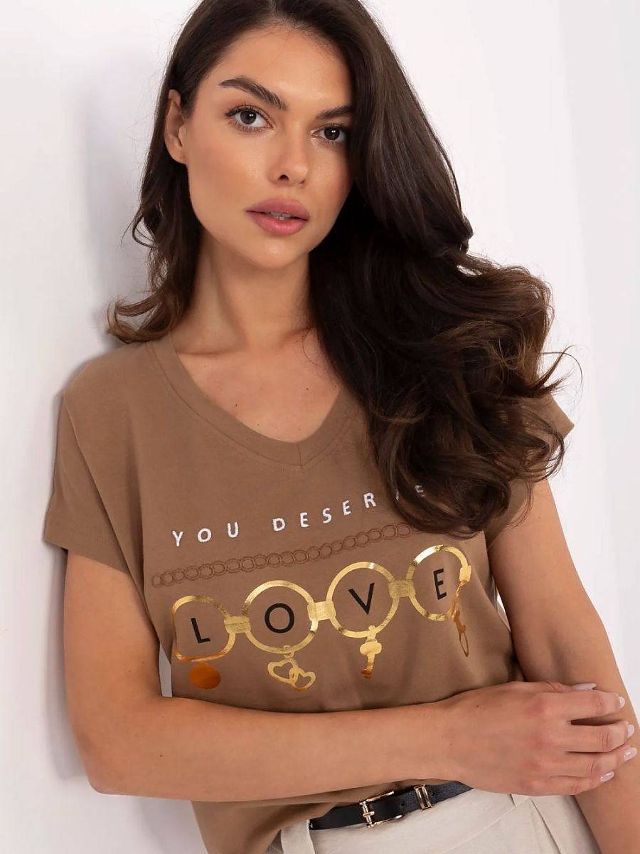 Casualowy t-shirt damski idealny na co dzień, łączący wygodę z modnym wykończeniem. Wykonany z miękkiej bawełny z dodatkiem elastanu, zapewnia komfort noszenia i lekkie dopasowanie do sylwetki. Model o standardowej długości, z krótkim rękawem i kobiecym dekoltem w serek, który pięknie podkreśla linię szyi. T-shirt wyróżnia się efektownym połączeniem nadruku i subtelnego haftu, tworząc oryginalny, a zarazem stylowy detal. Idealny wybór dla kobiet ceniących casualowy styl z nutą elegancji na co dzień.