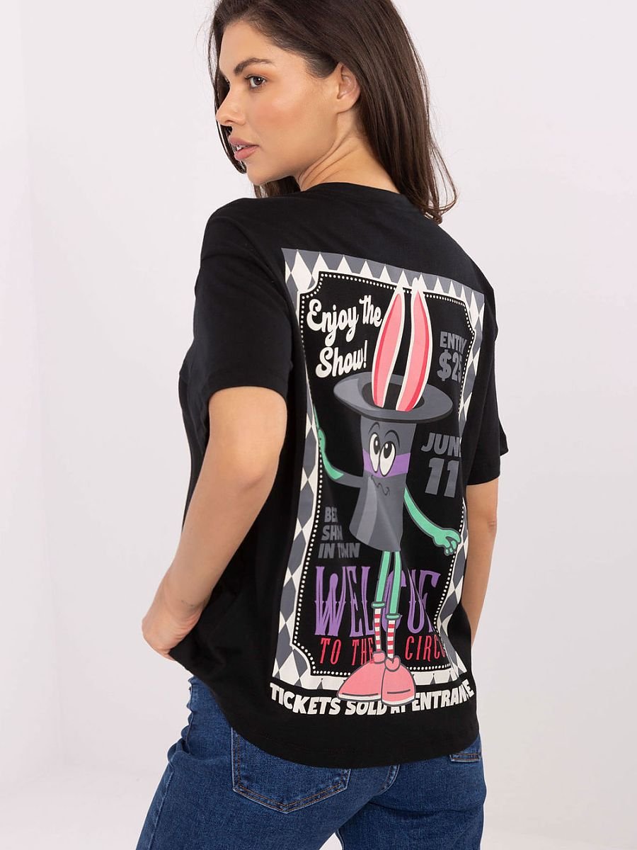 Damski T-shirt o casualowym charakterze, idealny na codzienne stylizacje. Wykonany z wysokiej jakości bawełny, która zapewnia wygodę i przewiewność przez cały dzień. Model o standardowej długości z krótkim rękawem i klasycznym okrągłym dekoltem doskonale dopasowuje się do sylwetki, oferując swobodę ruchów. T-shirt wyróżnia się nadrukiem z przodu oraz efektownym nadrukiem i napisami na plecach, które nadają mu nowoczesny i wyrazisty styl. To uniwersalna propozycja, która świetnie sprawdzi się w zestawieniu z jeansami, szortami czy spódnicą idealna na co dzień.