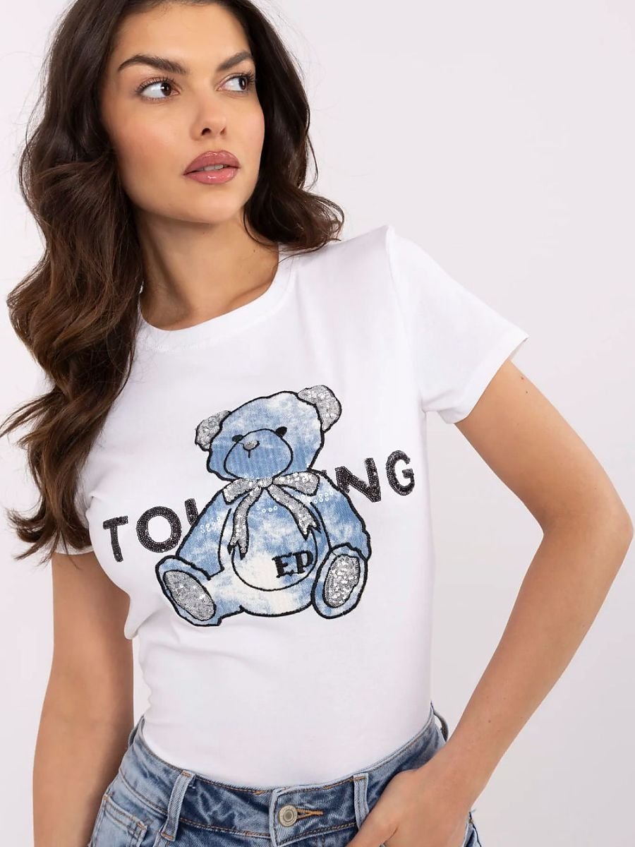 Uroczy i stylowy t-shirt damski, idealny na co dzień. Wykonany z miękkiej bawełny z dodatkiem elastanu, zapewnia komfort noszenia i świetne dopasowanie do sylwetki. Klasyczny, okrągły dekolt oraz standardowa długość sprawiają, że pasuje do wielu stylizacji. Krótki rękaw dodaje lekkości, a oryginalne detale, takie jak haft w kształcie misia z cekinami nadają mu wyjątkowego charakteru. To idealny wybór dla kobiet ceniących casualowy styl z modnymi akcentami.